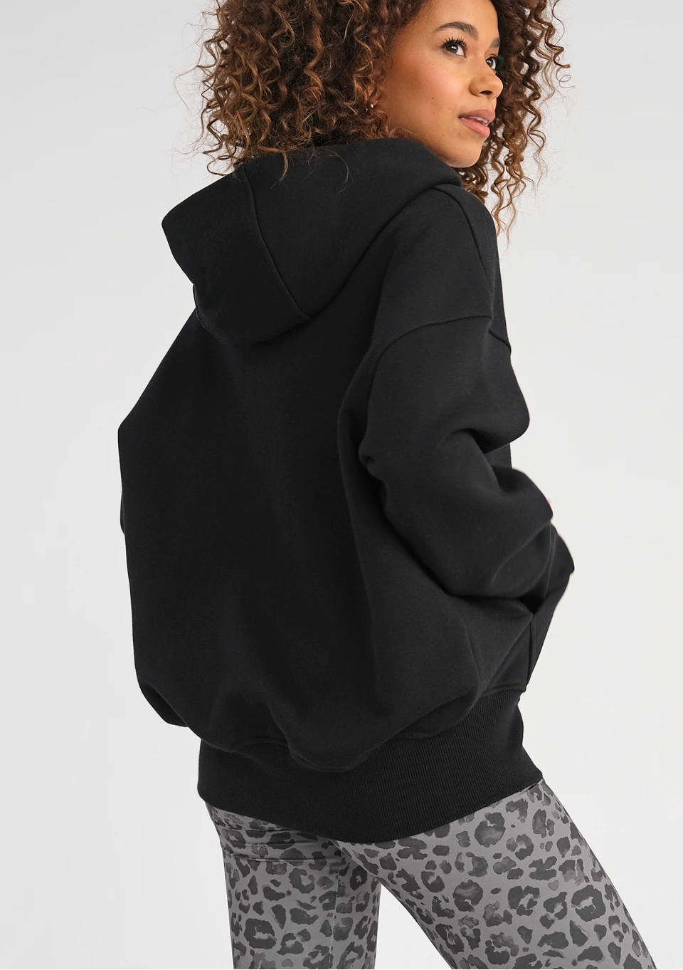Czarna bluza rozpinana z kapturem o wygodnie luźnym kroju oversize. Przyjemnie ogrzeje Cię miękką dzianiną w chłodne dni.