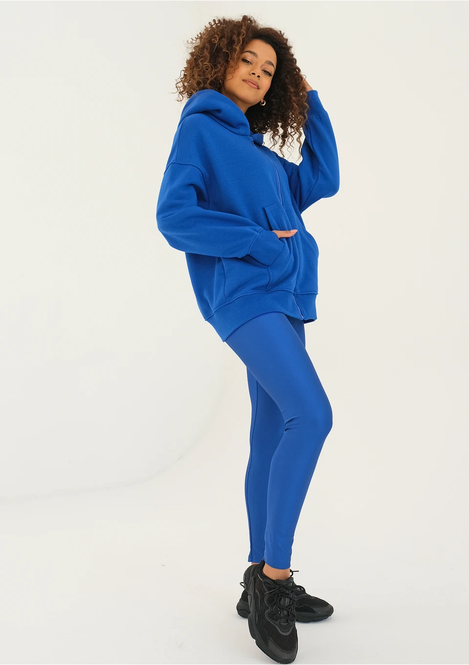 Kobaltowa bluza rozpinana z kapturem o wygodnie luźnym kroju oversize. Przyjemnie ogrzeje Cię miękką dzianiną w chłodne dni.