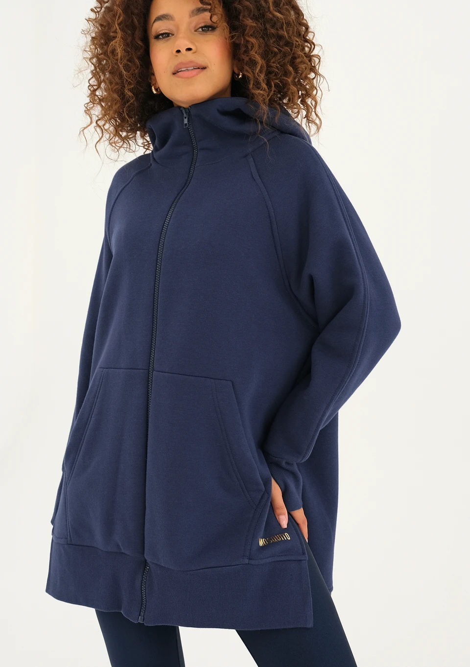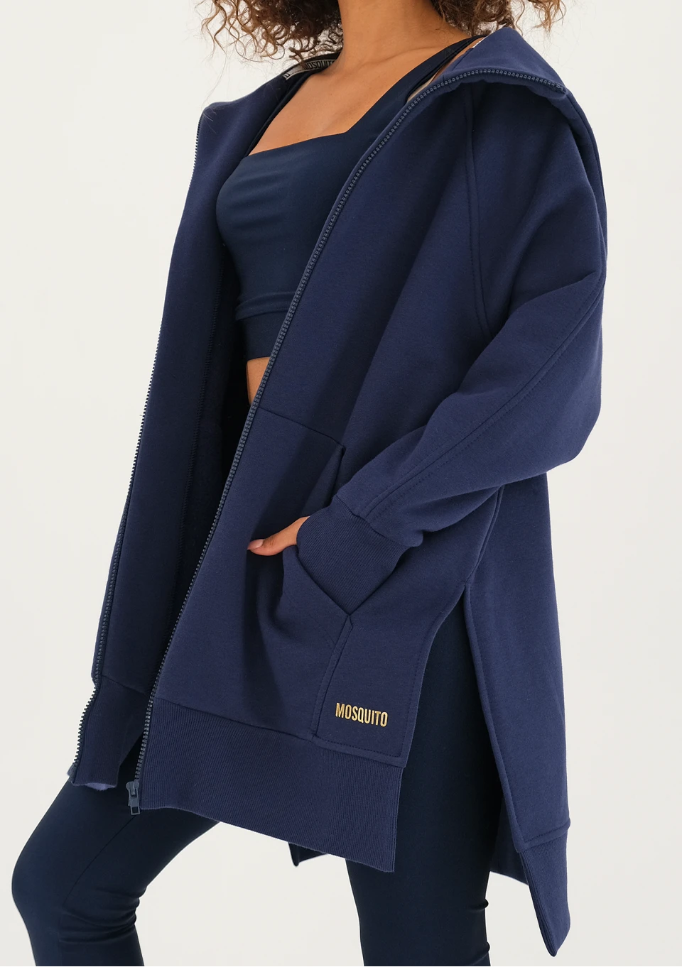 Długa, rozpinana bluza z kapturem. Fason świetnie sprawdzi się w chłodniejszym sezonie. Granatowy model zdobiony złotą, markową aplikacją.