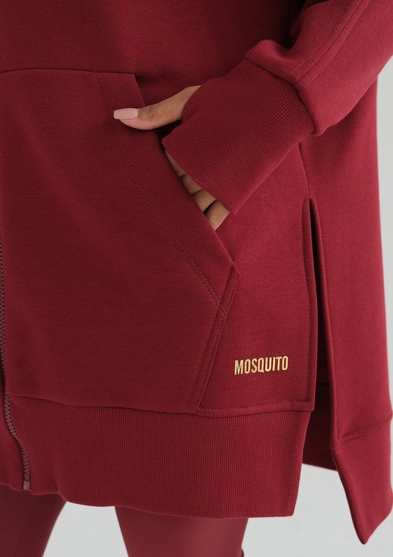 Długa bluza rozpinana z kapturem w czerwonym kolorze, ozdobiona markową aplikacją. Fason świetnie sprawdzi się w chłodniejszym sezonie.
