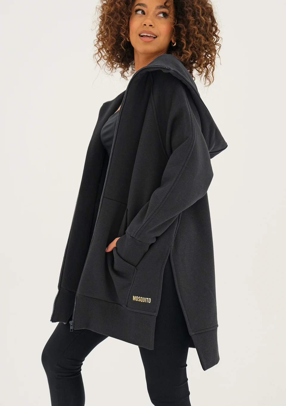 Długa, rozpinana bluza damska z kapturem. Fason świetnie sprawdzi się w chłodniejszym sezonie. Model w uniwersalnej czerni, zdobiony złotym logiem.