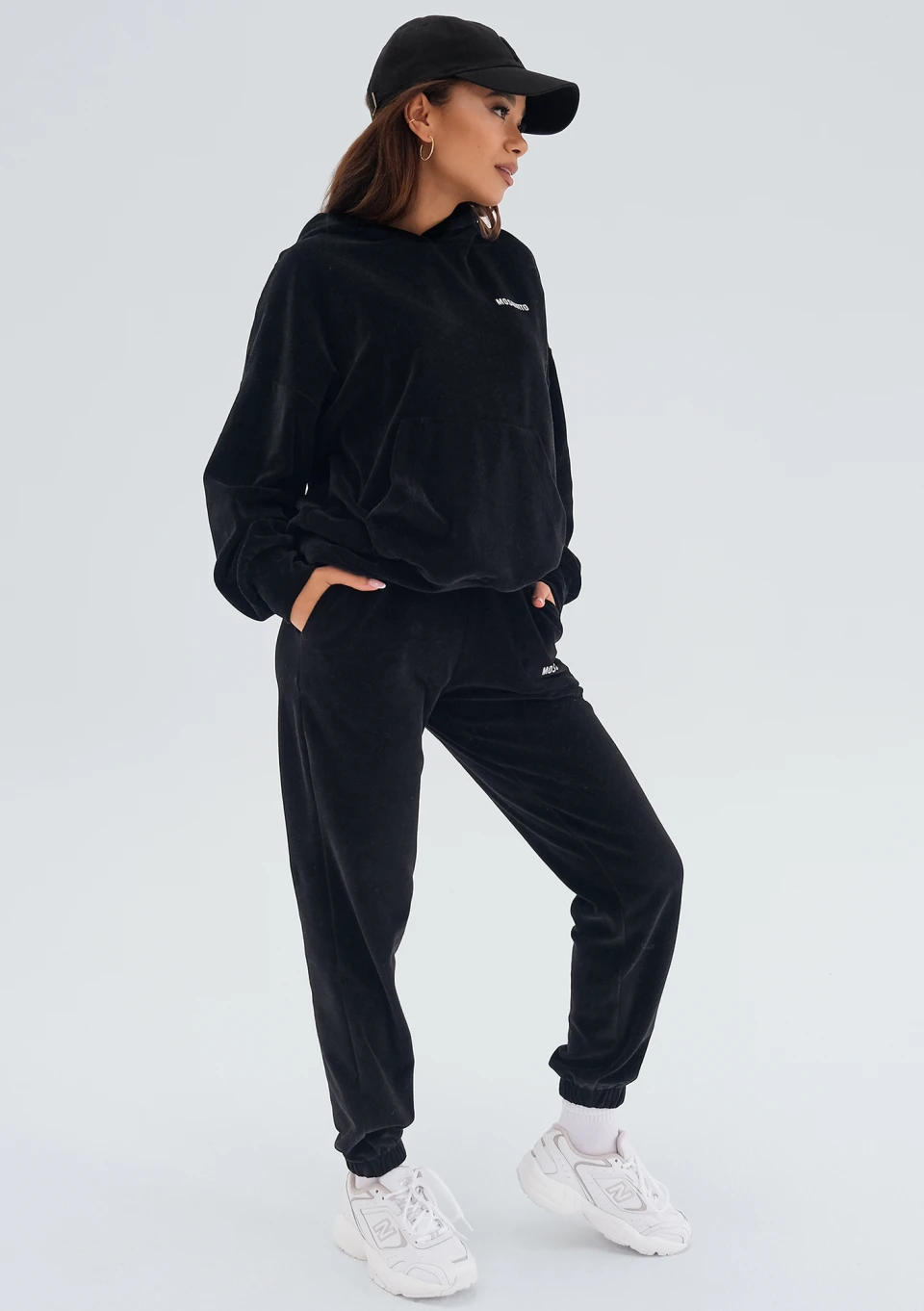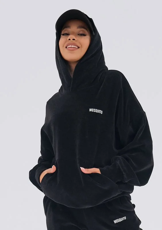 Czarna bluza o luźnym kroju z kieszenią i kapturem, wykonana z mięsistej dzianiny welurowej. Przyjemnie wygodny fason oversize stylowo układa się na sylwetce.