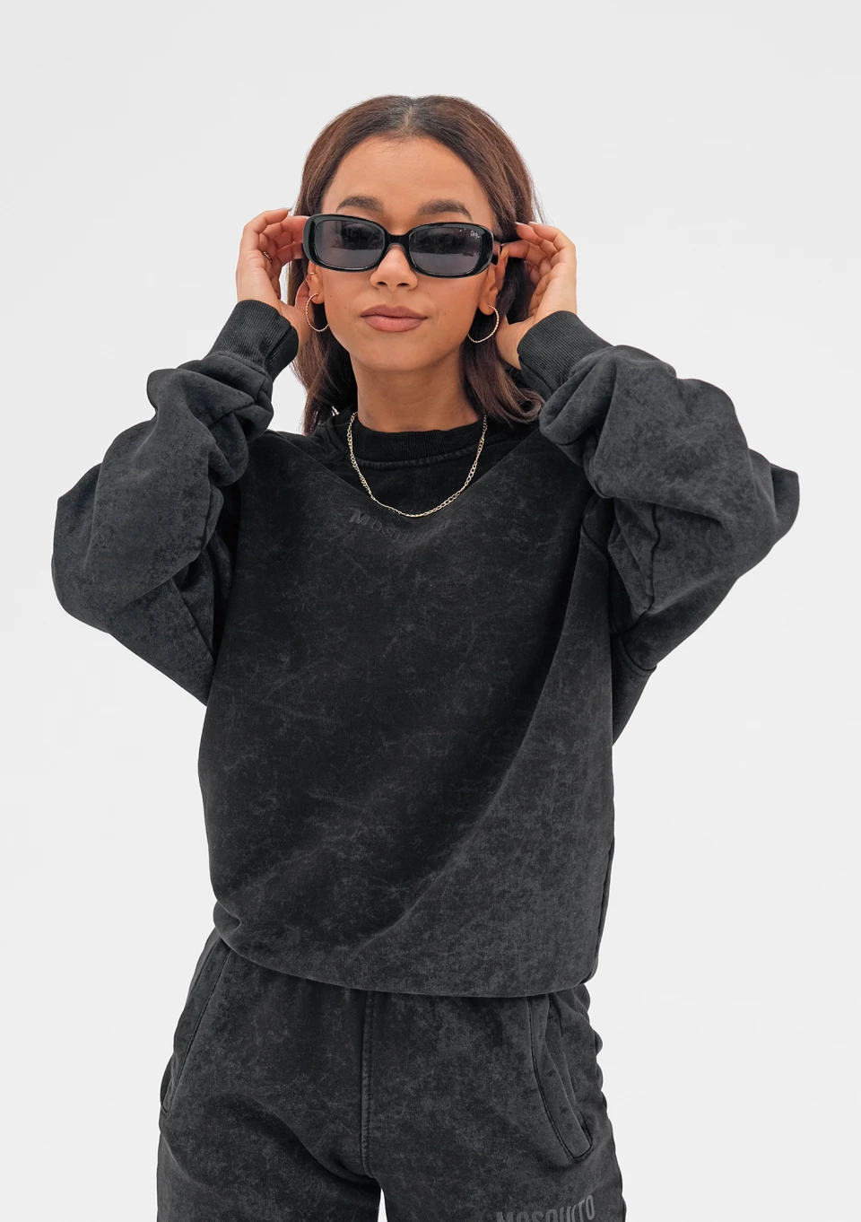 Czarna bluza damska ze stylowym efektem sprania. To modna propozycja wygodnej stylizacji na zimę i sezon przejściowy. Fason posiada poduszki na ramionach.