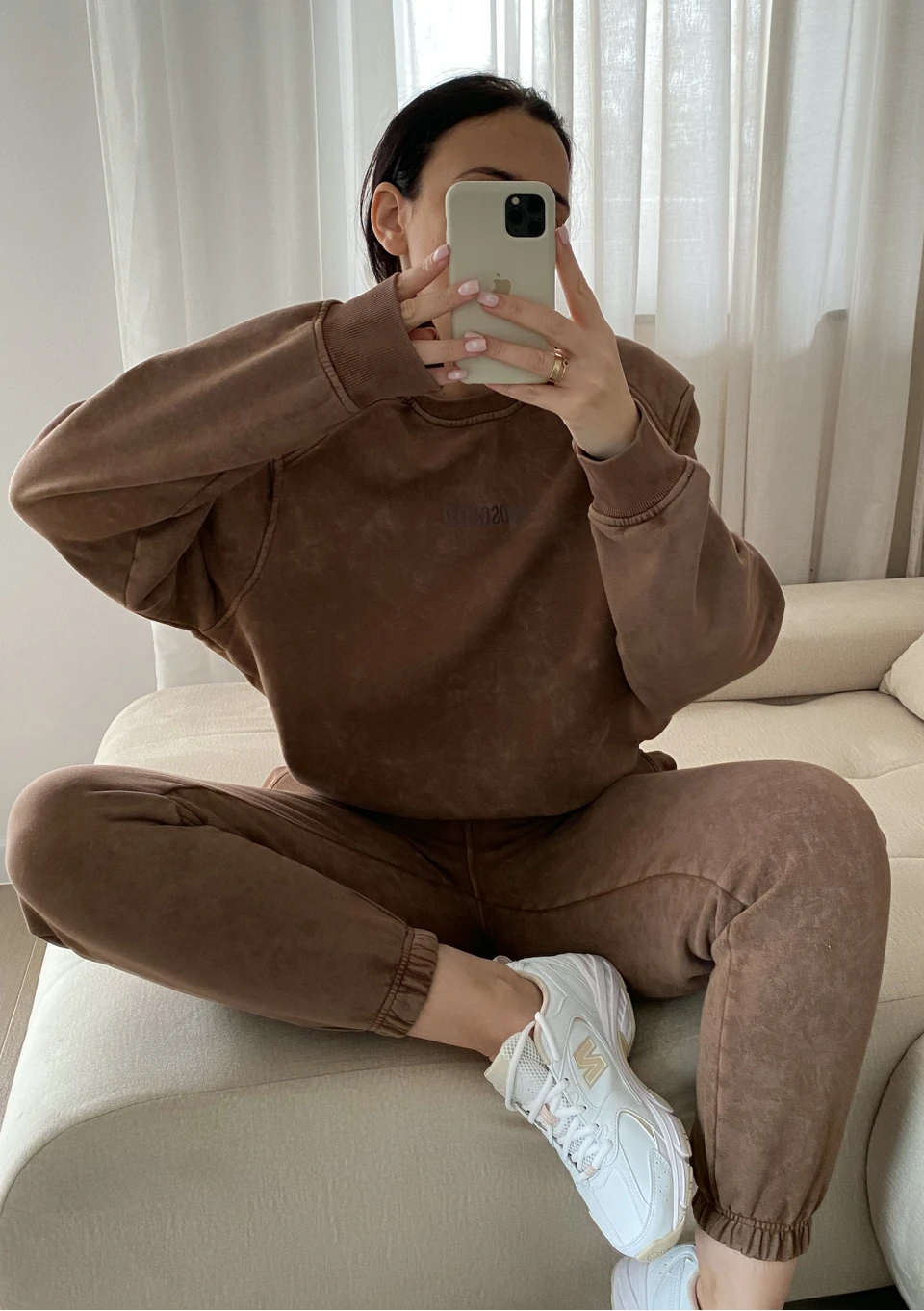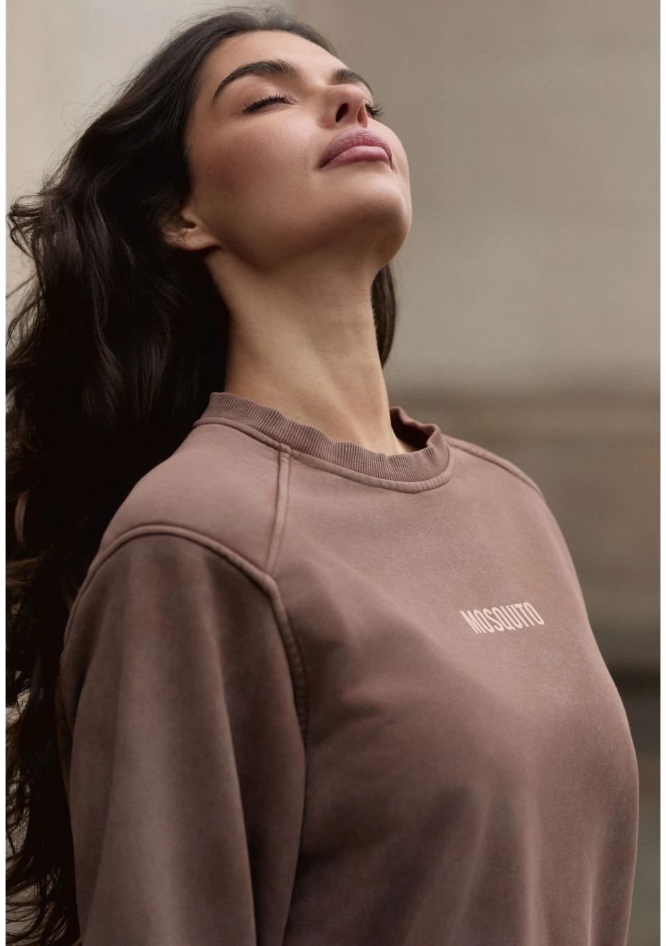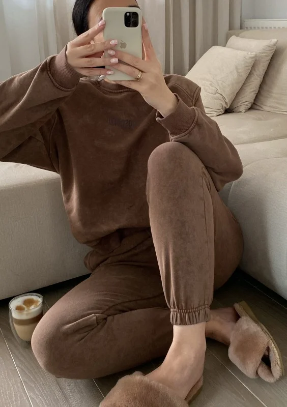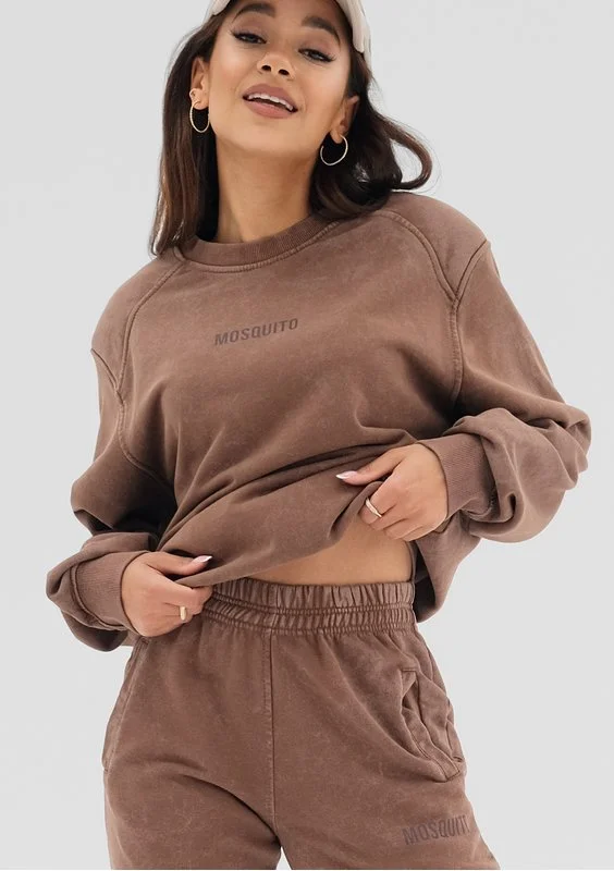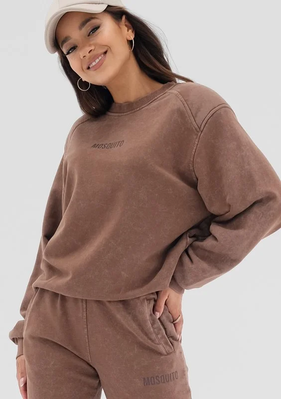 Brązowa bluza damska ze stylowym efektem sprania i poduszkami na ramionach. To modna propozycja wygodnego okrycia na zimę i sezon przejściowy.