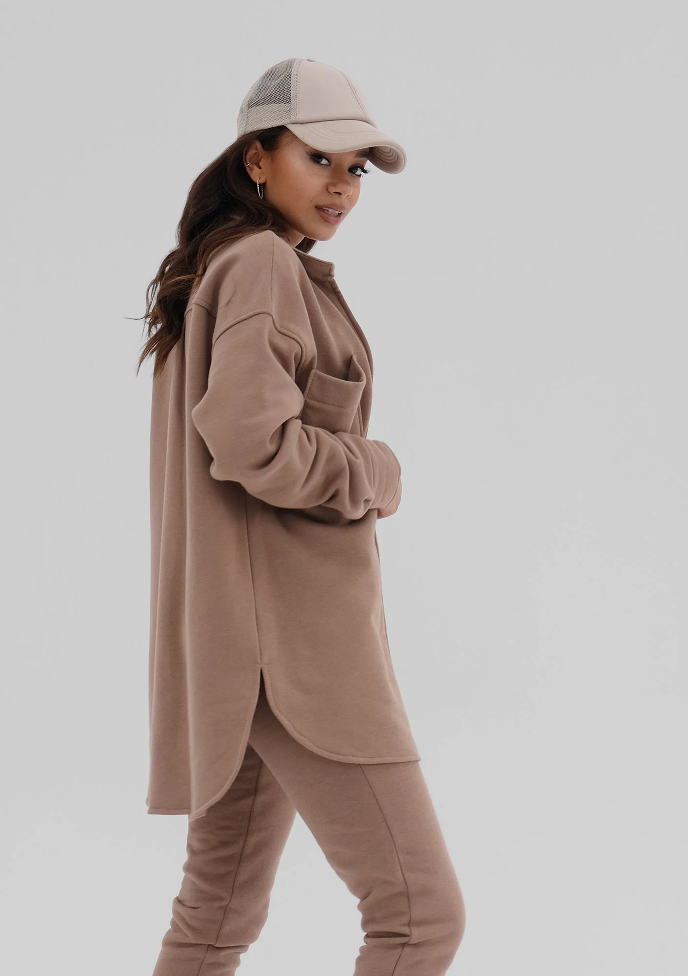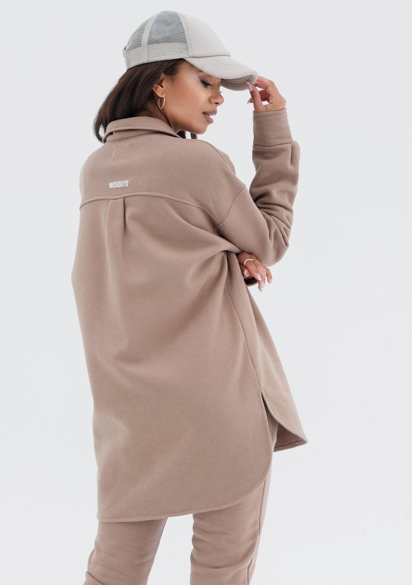 Unikatowa bluza damska w kawowym beżu. Szukając pomysłu na oryginalną i inną, niż wszystkie bluzę dresową, Alicja Komar postanowiła wykreować całkiem zaskakujący fason o koszulowym kroju.