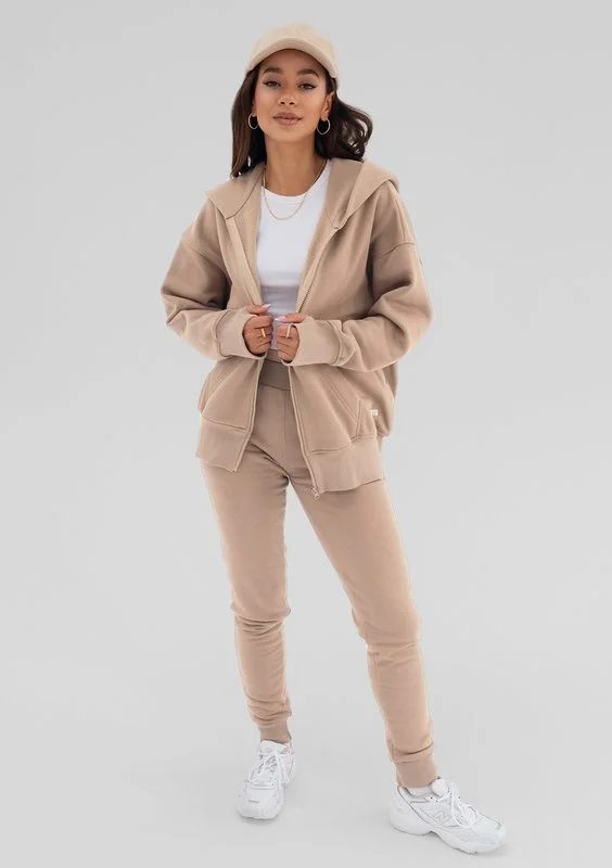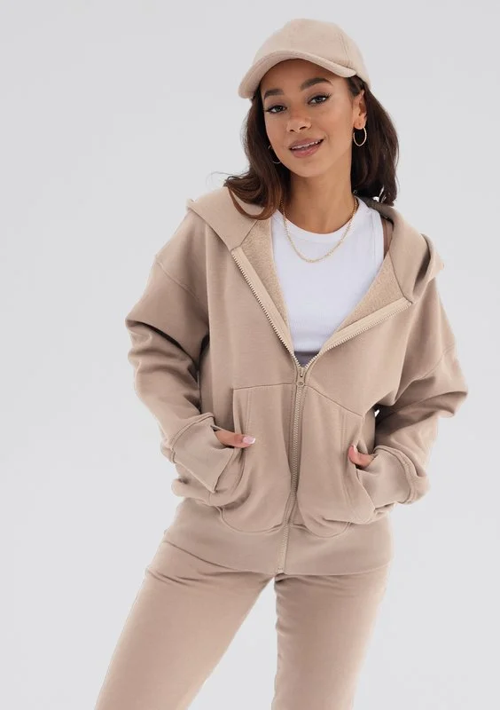 Rozpinana bluza damska z kapturem o wygodnym kroju oversize. Model w piaskowym odcieniu uszyliśmy z miękkiej dzianiny bawełnianej.