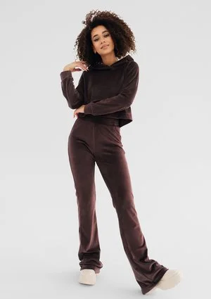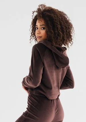 Brązowa bluza damska z kapturem z delikatnego materiału o aksamitnej fakturze. Model z kapturem to synonim stylu i wygody, których każda z nas szuka w odzieży codziennej.