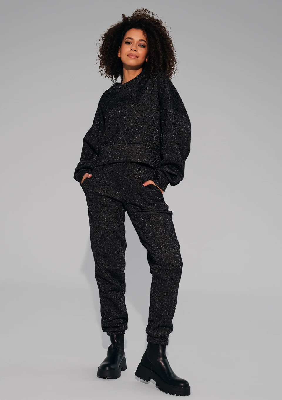 Czarna bluza damska o swobodnym kroju oversize z przepięknym efektem błyszczenia. Model z dzianiny bawełnianej ze srebrną nicią i drobnym, czarnym logiem.