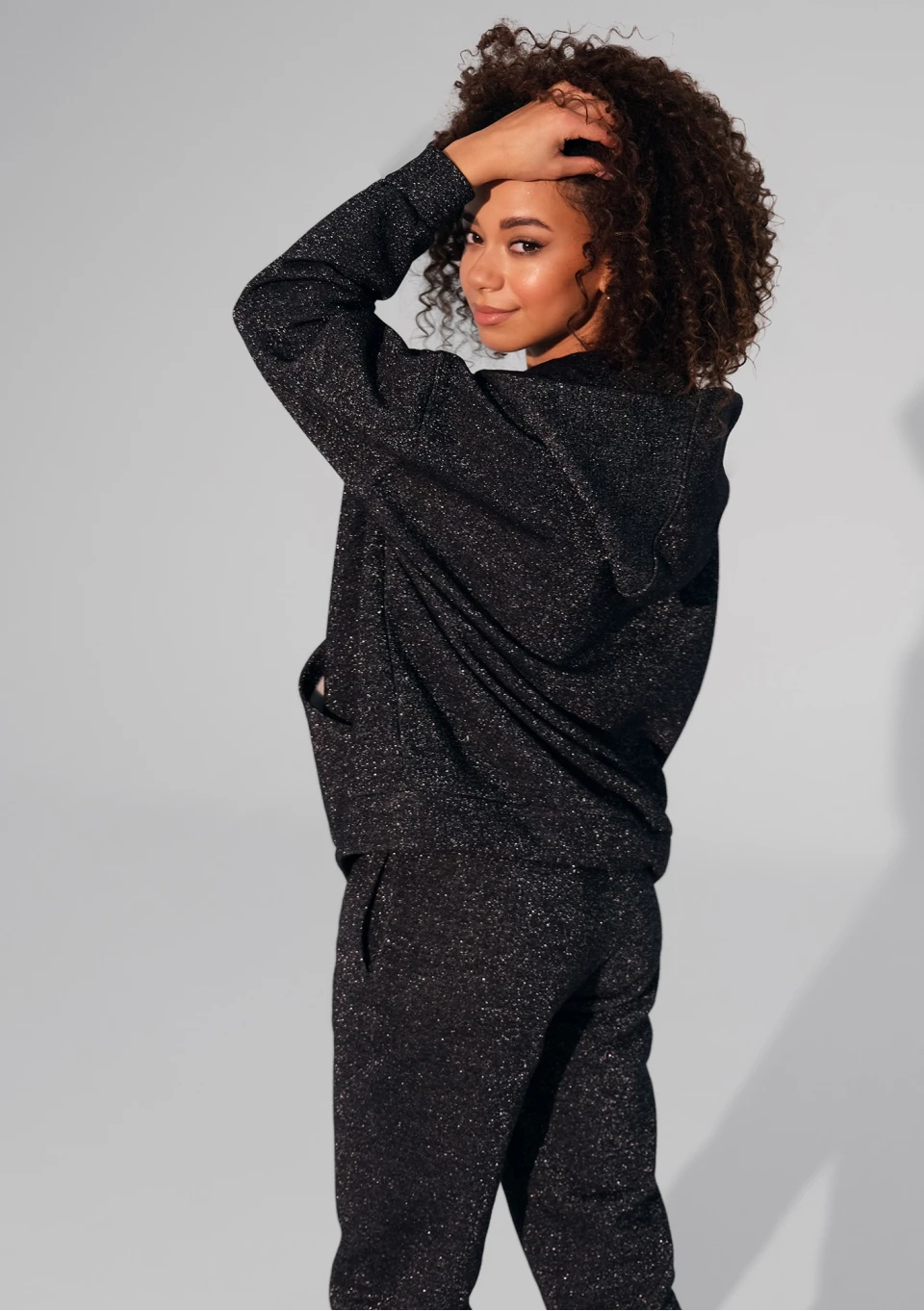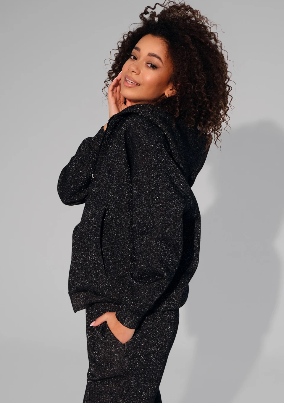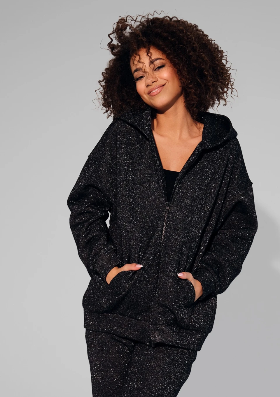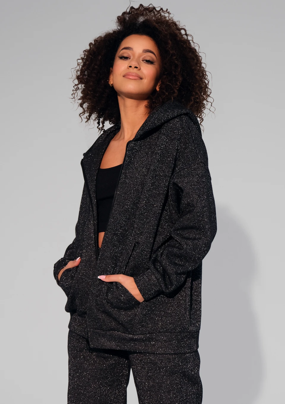 Ta czarna, rozpinana bluza damska przepięknie błyszczy dzięki srebrnej nici. Ma wygodny, luźny krój i kaptur.