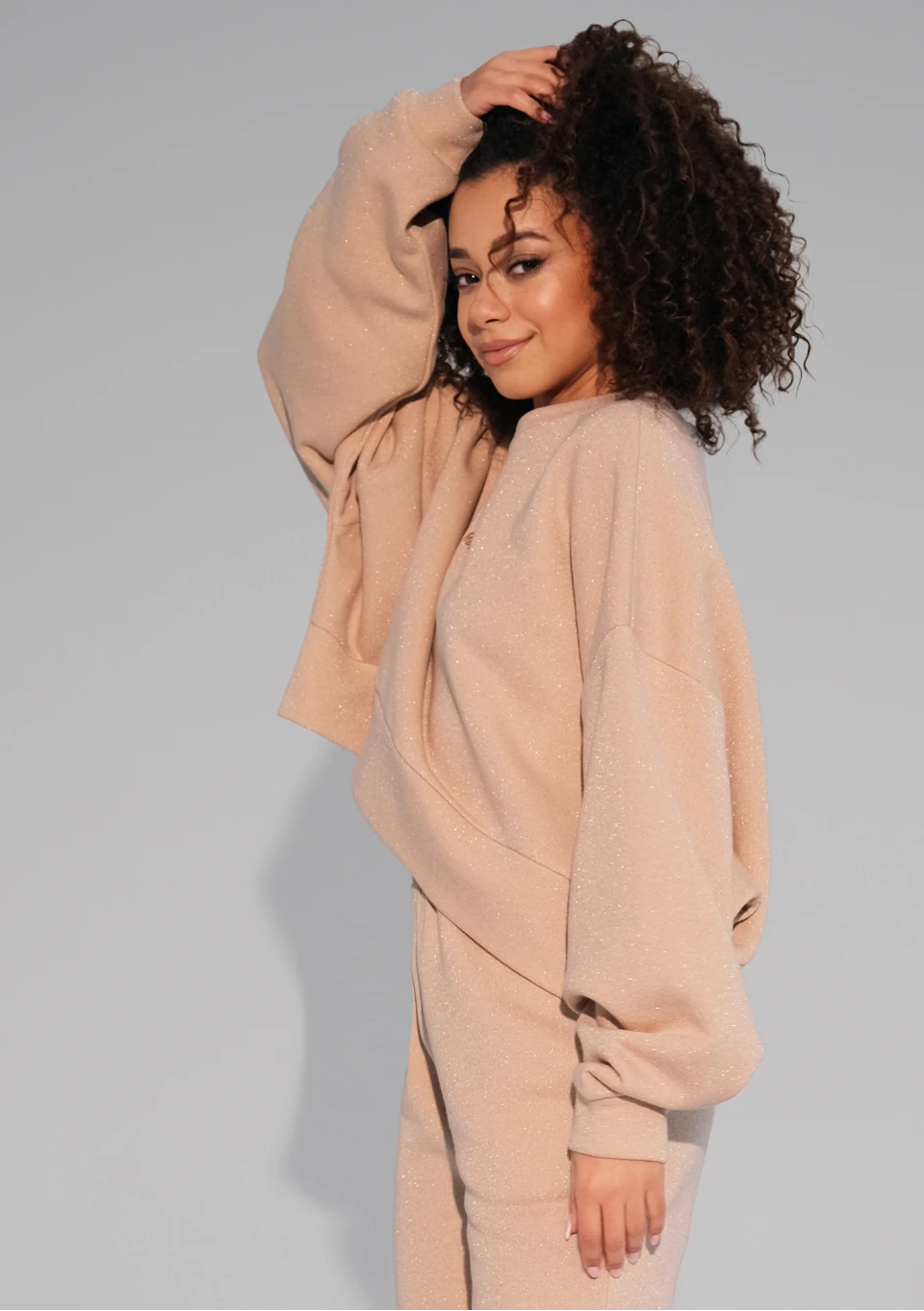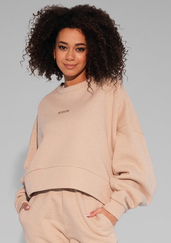 Beżowa bluza damska o swobodnym kroju oversize z przepięknym połyskiem. Model z miękkiej dzianiny bawełnianej ze złotą nicią i drobnym logiem.