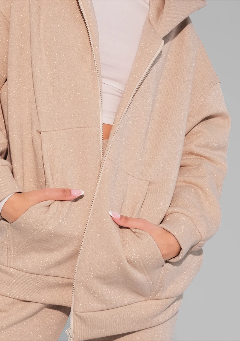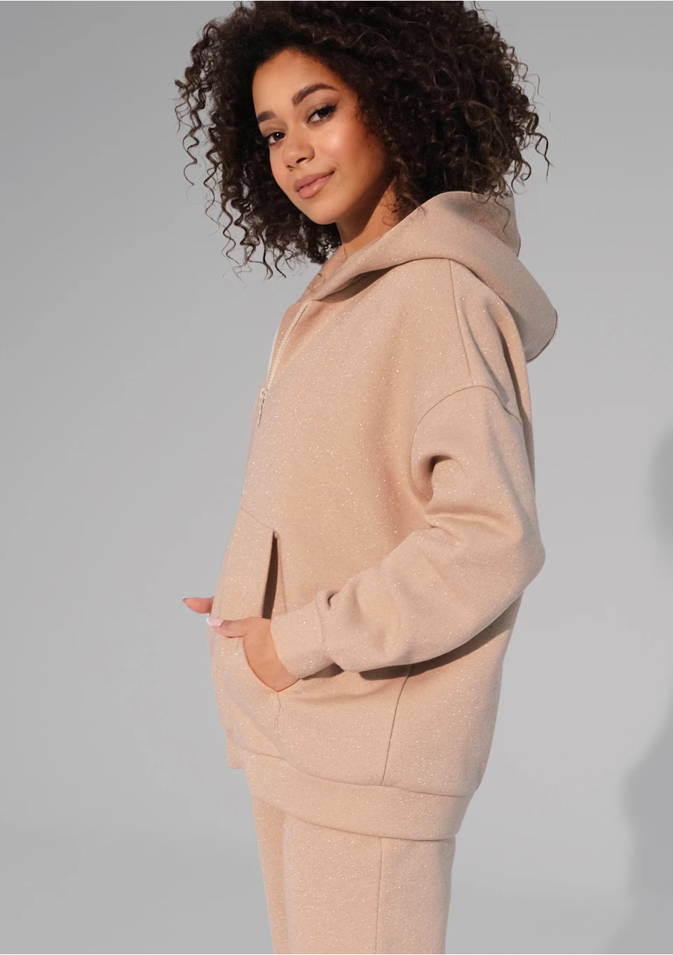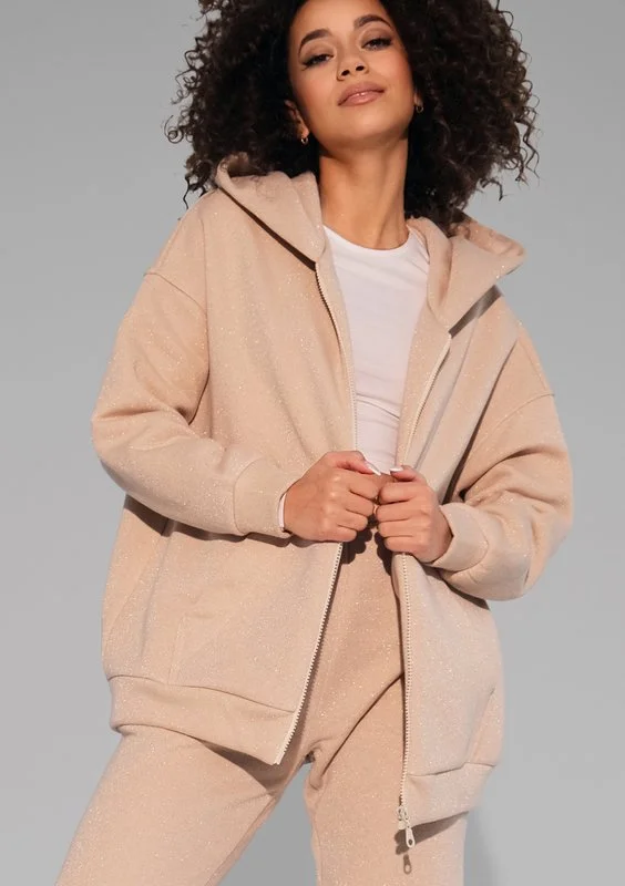 Ta beżowa, rozpinana bluza damska przepięknie błyszczy dzięki złotej nici. Ma luźny krój i wygodny kaptur.