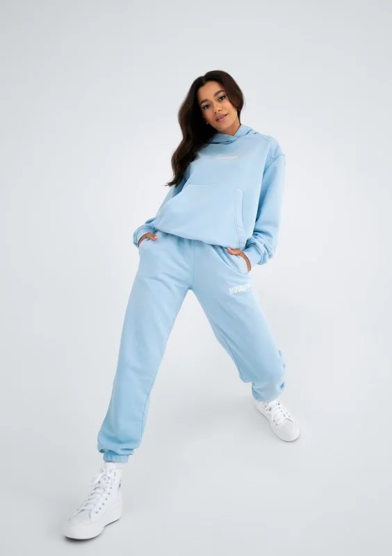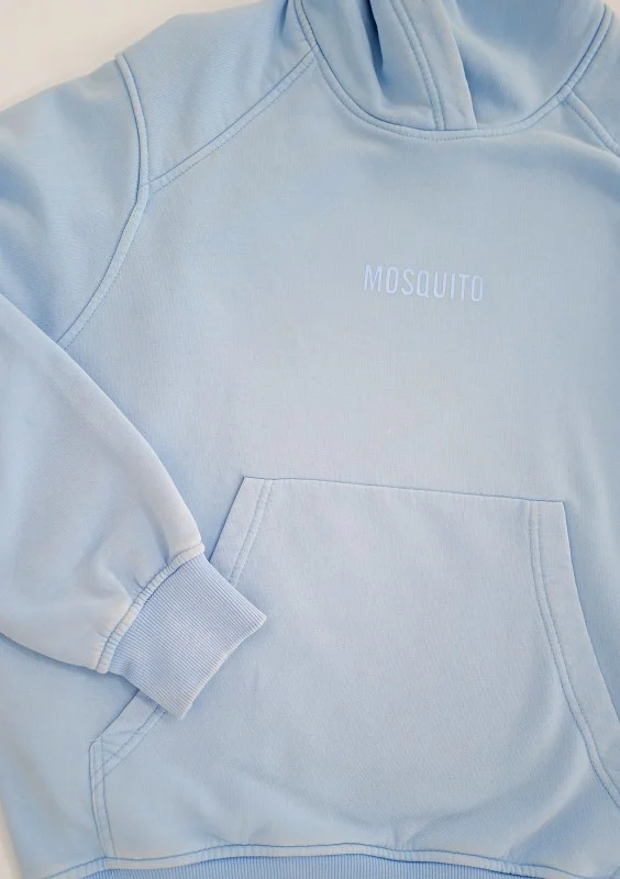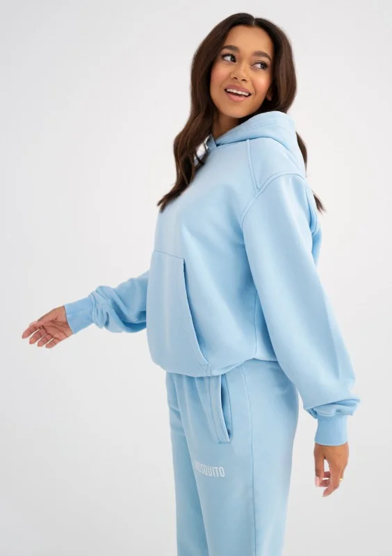 Błękitna bluza damska z kapturem i stylowym efektem sprania. Modna kangurka została wykonana z miękkim meszkiem od spodu. Model posiada poduszki na ramionach.