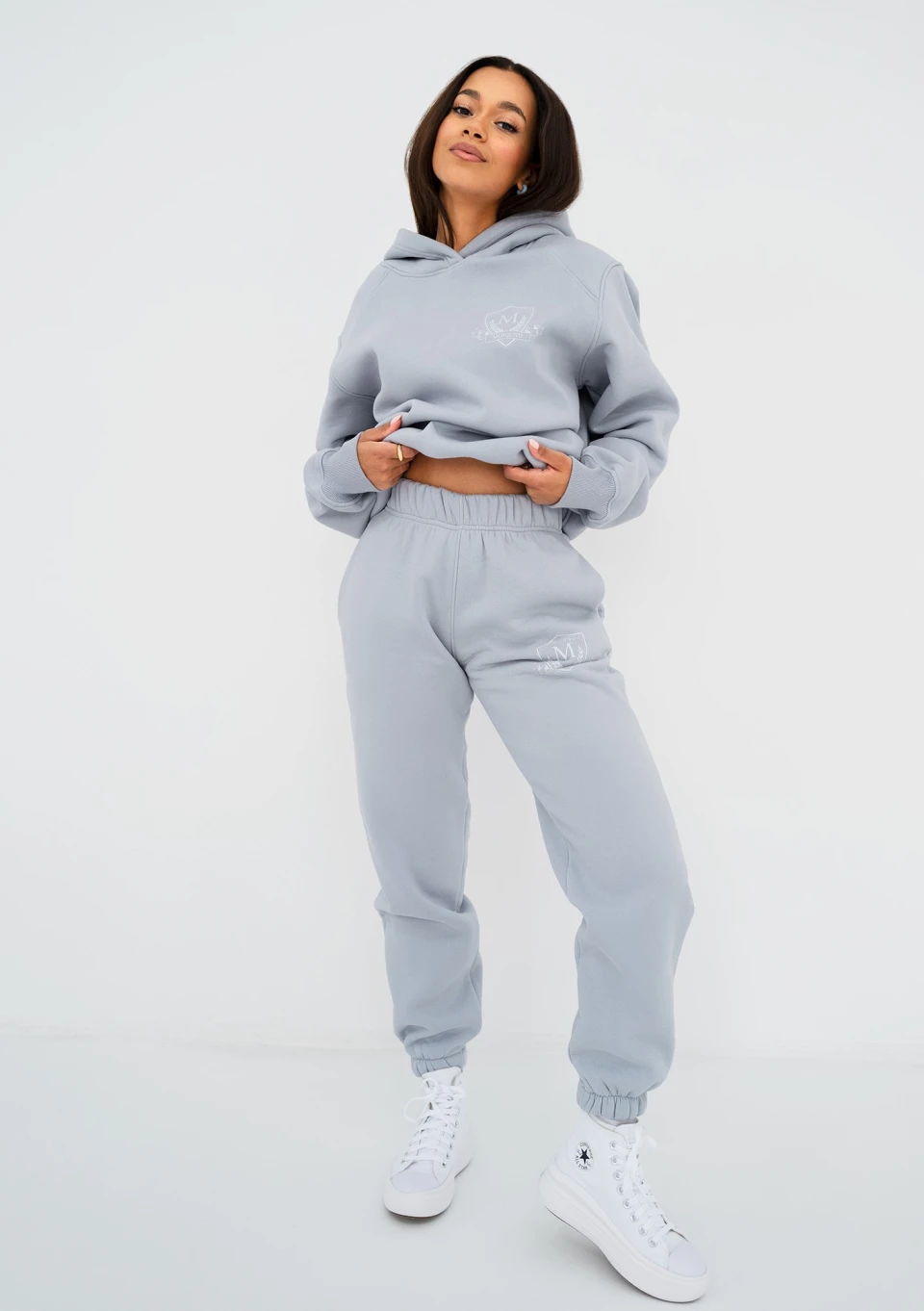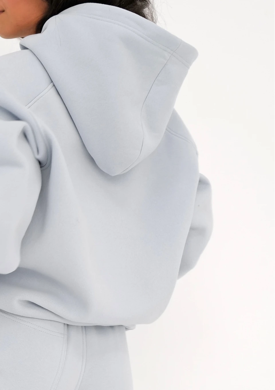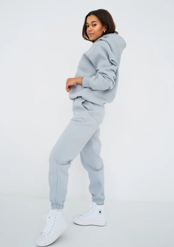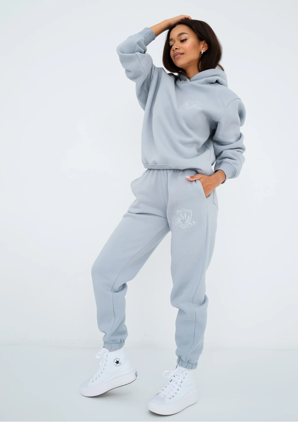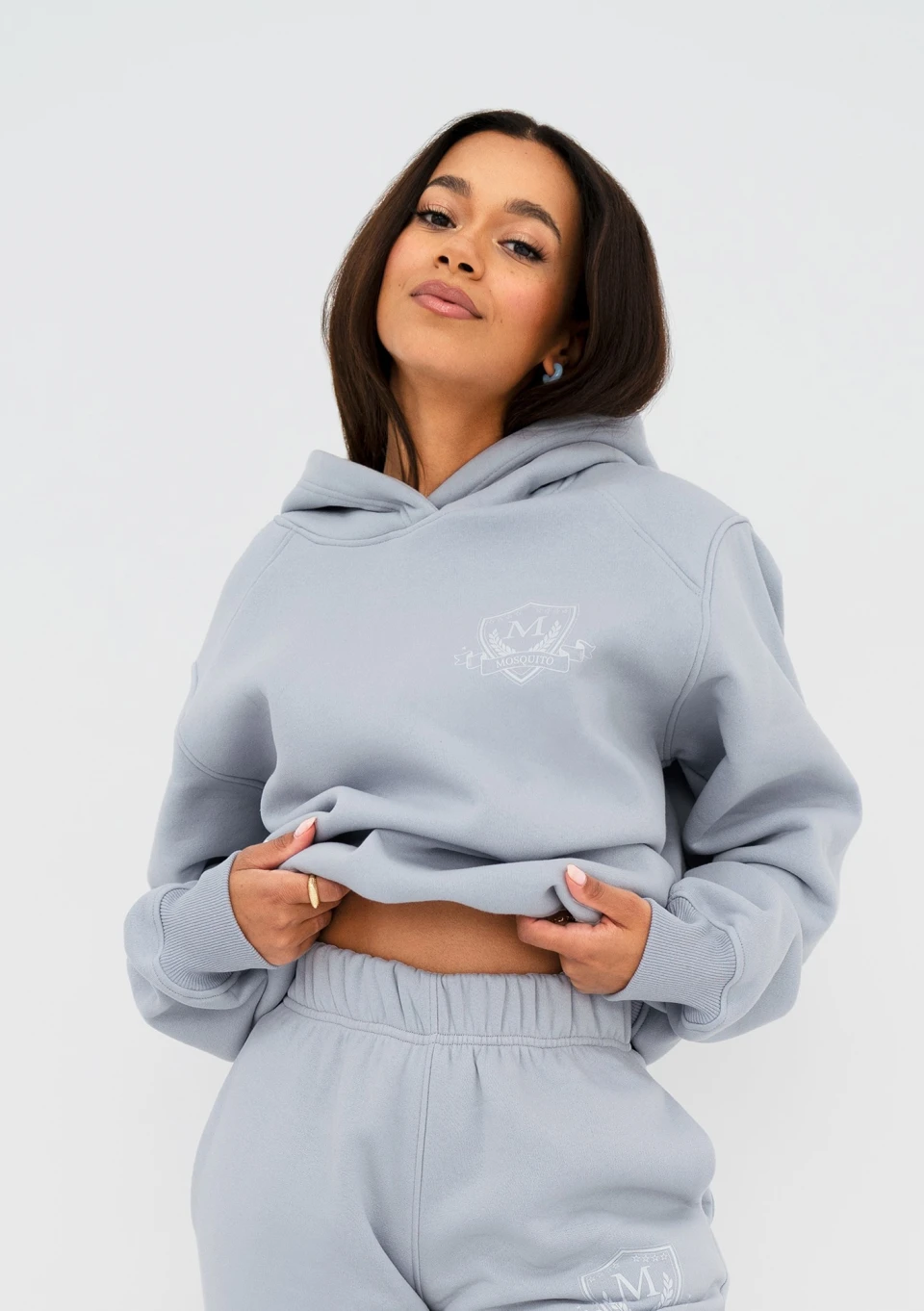 Błękitna bluza oversize z wygodnym kapturem i elastycznymi ściągaczami. Model z dzianiny z meszkiem, ozdobiony logiem w stylu college.