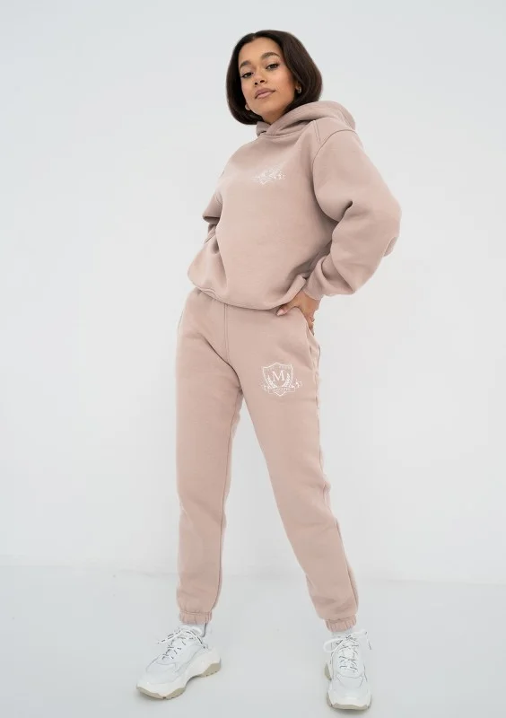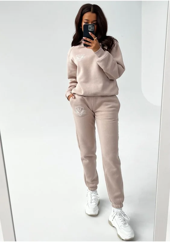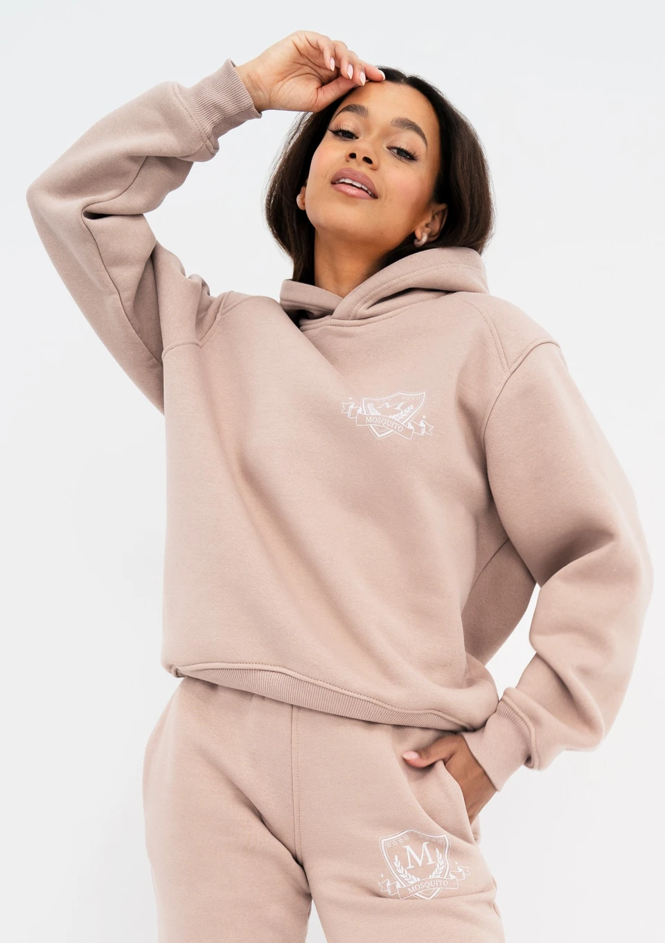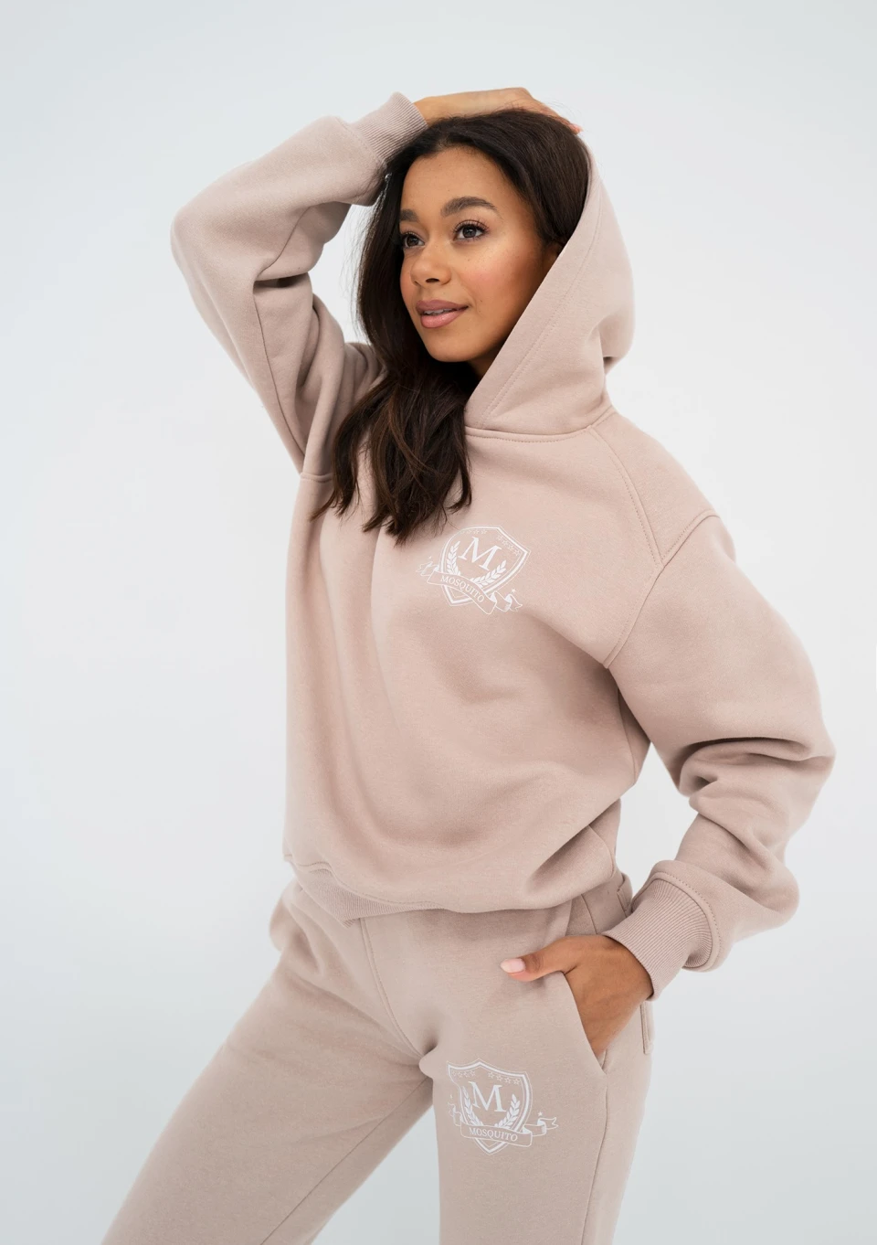 Beżowa bluza oversize z wygodnym kapturem i elastycznymi ściągaczami. Model z dzianiny z meszkiem, ozdobiony logiem w stylu college.