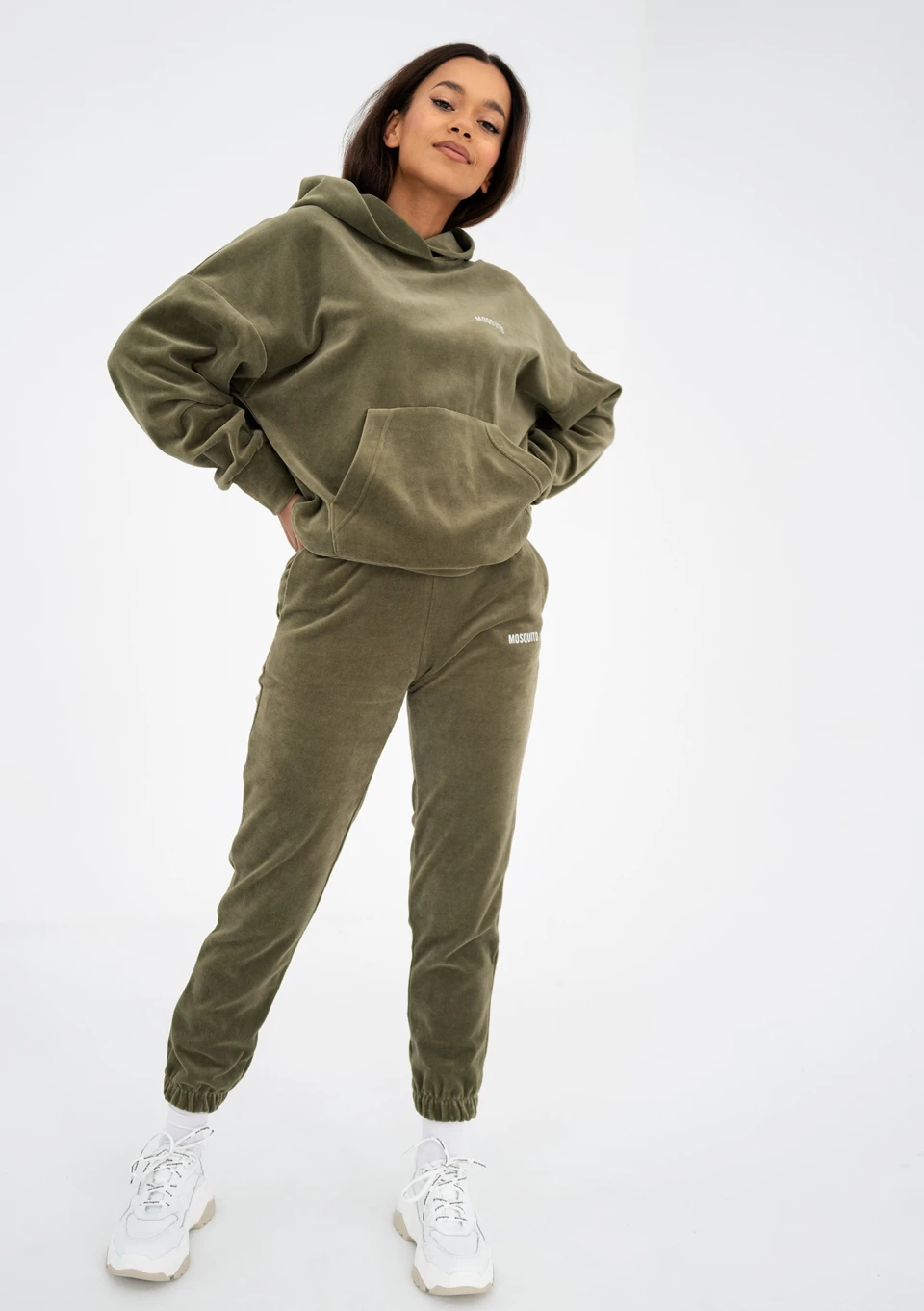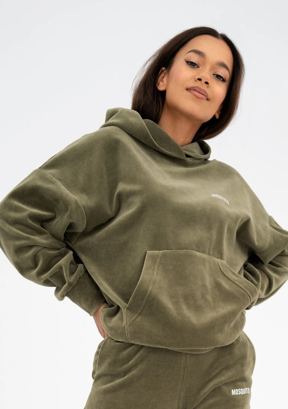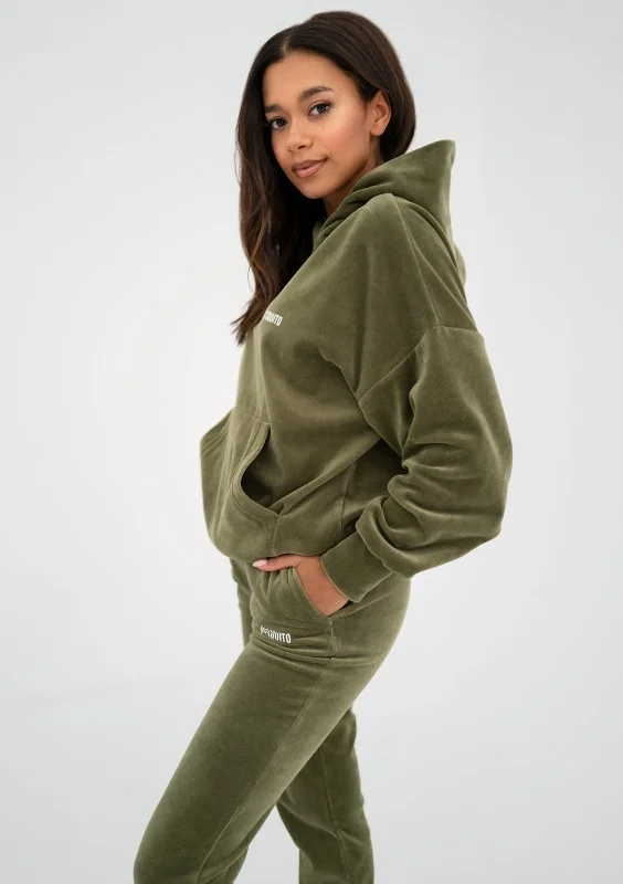 Stylowa bluza z kieszenią i kapturem, wykonana z miękkiego weluru. Oczaruje Cię wygodnym fasonem oversize i wyjątkową, oliwkową zielenią.