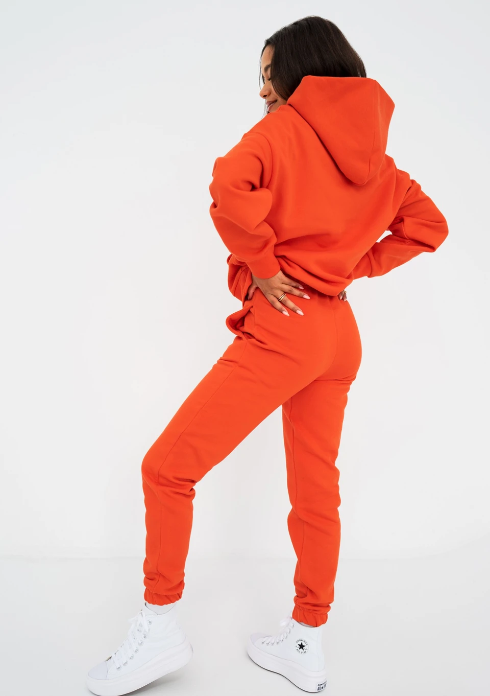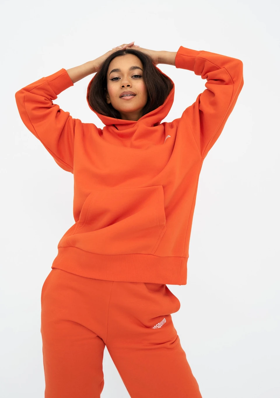 Pomarańczowa bluza damska o stylowym kroju oversize z kapturem i kieszenią. Wygodnie układa się na sylwetce, zapewnia pełną swobodę.