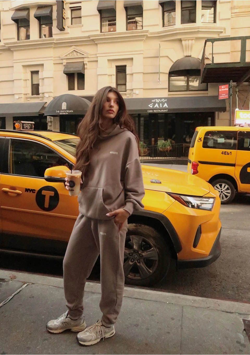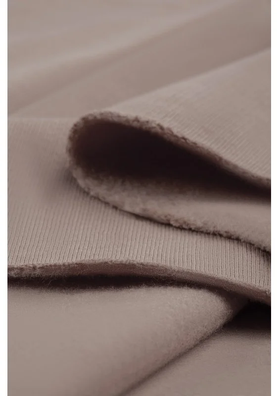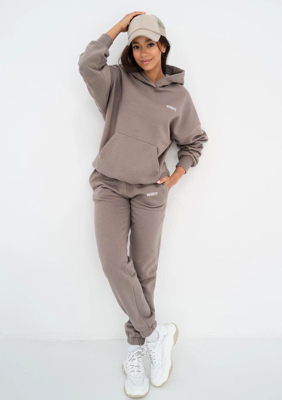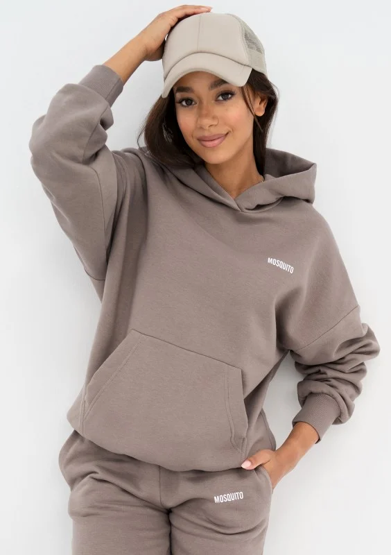 Modna bluza damska o stylowym kroju oversize z kapturem i kieszenią. Wykonana w odcieniu taupe, z dzianiny bawełnianej z miękkim meszkiem od spodu.