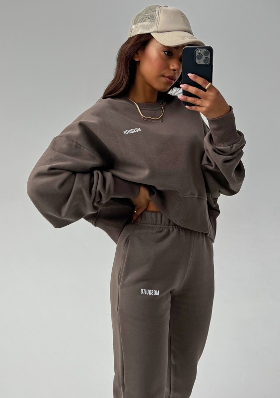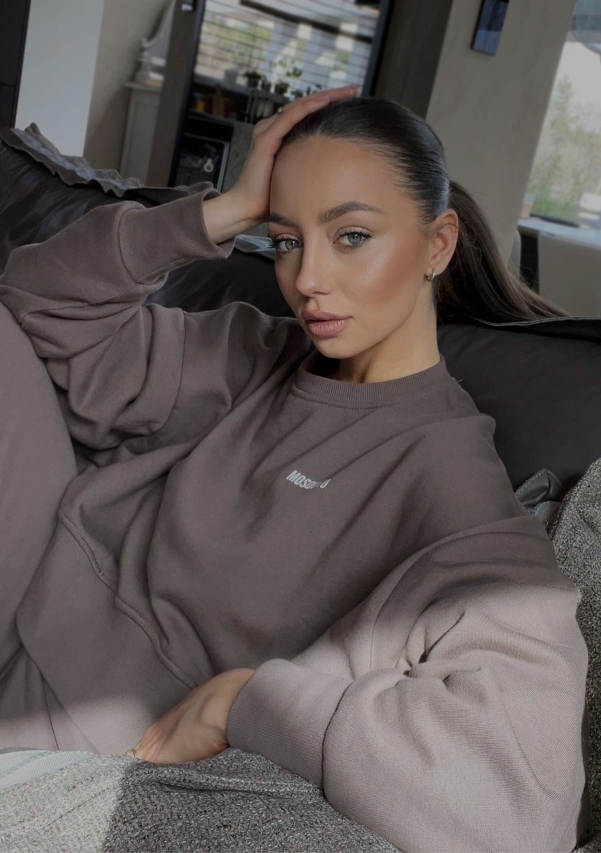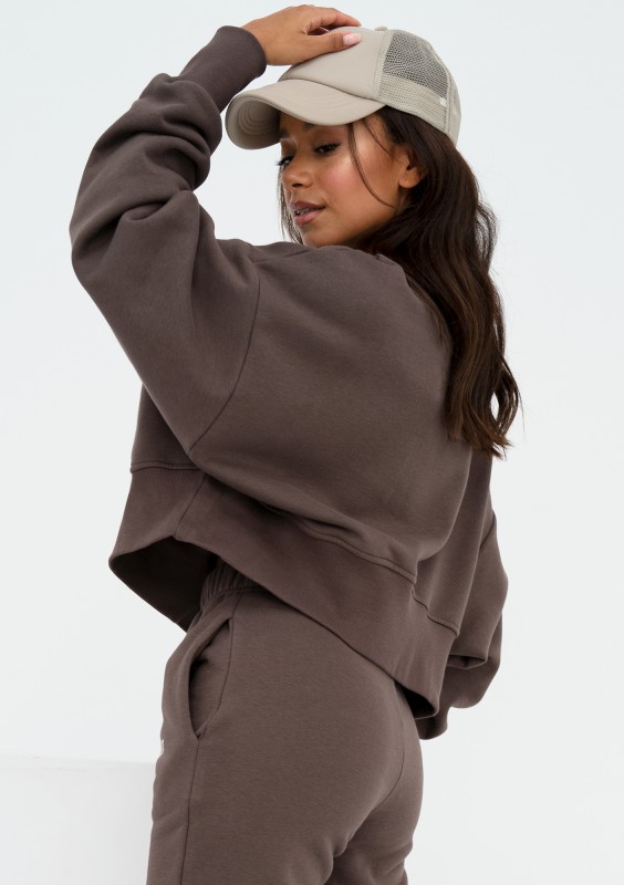 Stylowa bluza damska o swobodnym kroju oversize. Model brązowy, wykonany z dzianiny bawełnianej z miękkim meszkiem od spodu.