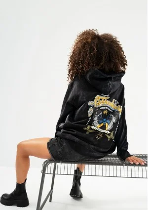 Bluza damska z kapturem z efektem sprania i kolorowym nadrukiem doda Twoim stylizacjom rockowego pazura. Motywujące hasło zdobiące aplikację zostało zaprojektowane w najmodniejszym stylu. ,,Surrealness" (Surrealność), ,,Mosquito", ,,Become the change" (Stań się zmianą), ,,Never give up" (Nigdy się nie poddawaj) stanowią motywujący i unikatowy wzór, który doskonale współgra z efektem tie dye.