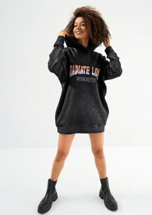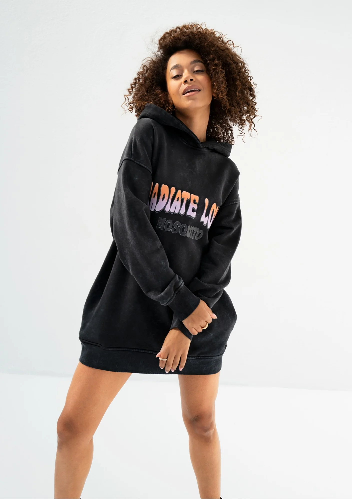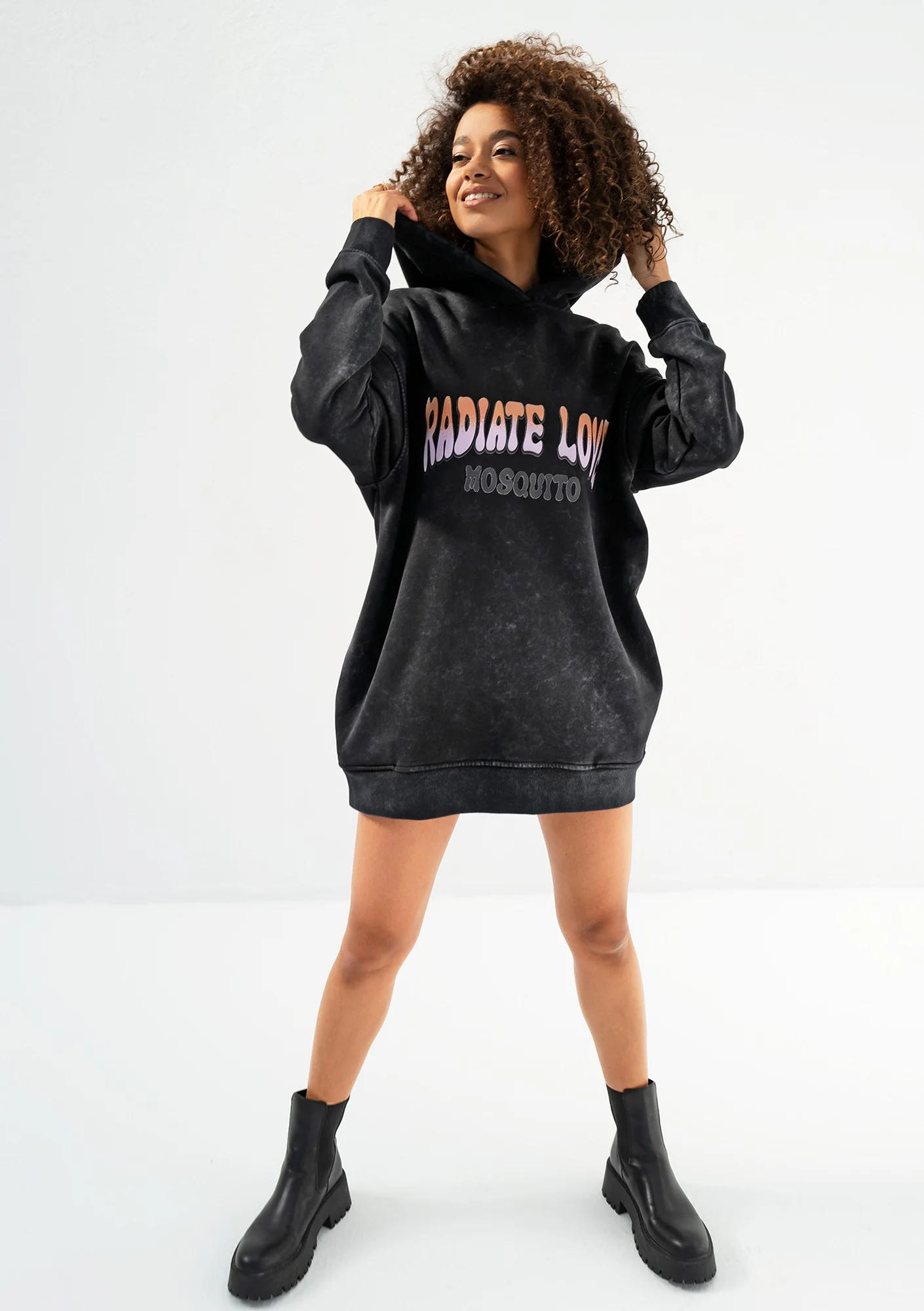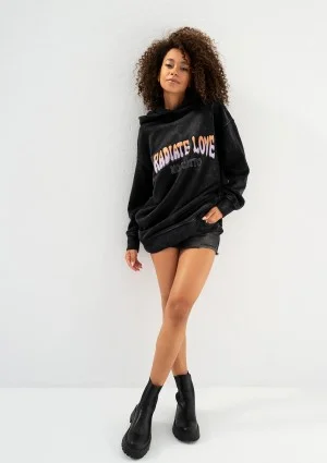 Bluza damska z kapturem z efektem sprania i kolorowym nadrukiem doda Twoim stylizacjom rockowego pazura. Motywujące hasło zdobiące aplikację zostało zaprojektowane w najmodniejszym stylu. ,,Radiate love" (Promieniuj miłością), ,,Mosquito" oraz ,,Magic Garden" (Magiczny ogród) stanowią unikatowy wzór, który doskonale współgra z efektem tie dye.