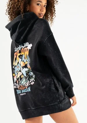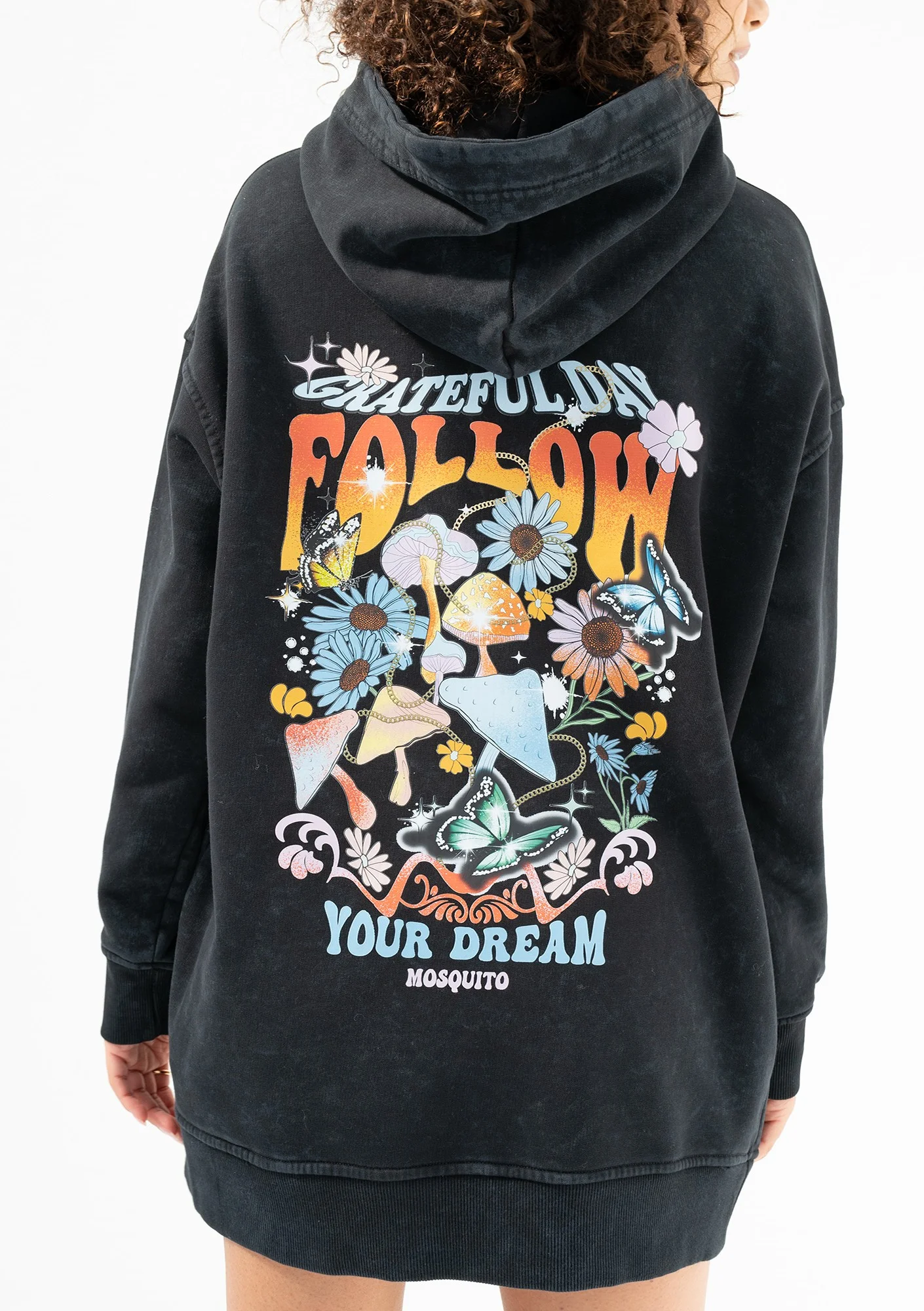 Stworzyliśmy wygodny model dla miłośniczek gorącego trendu na ubrania w stylu vintage; to czarna bluza damska o długim kroju, wyposażona w praktyczny kaptur, boczne kieszenie i elastyczne ściągacze. Uszyliśmy ją z przyjemnie miękkiej dzianiny, farbowanej techniką tie dye. Prezentowany fason zdobi kolorowa, pełna pozytywnych wibracji grafika z motywującym hasłem ,,Follow your dream" (Podążaj za marzeniami).