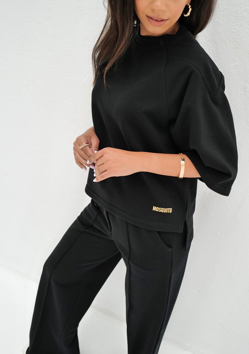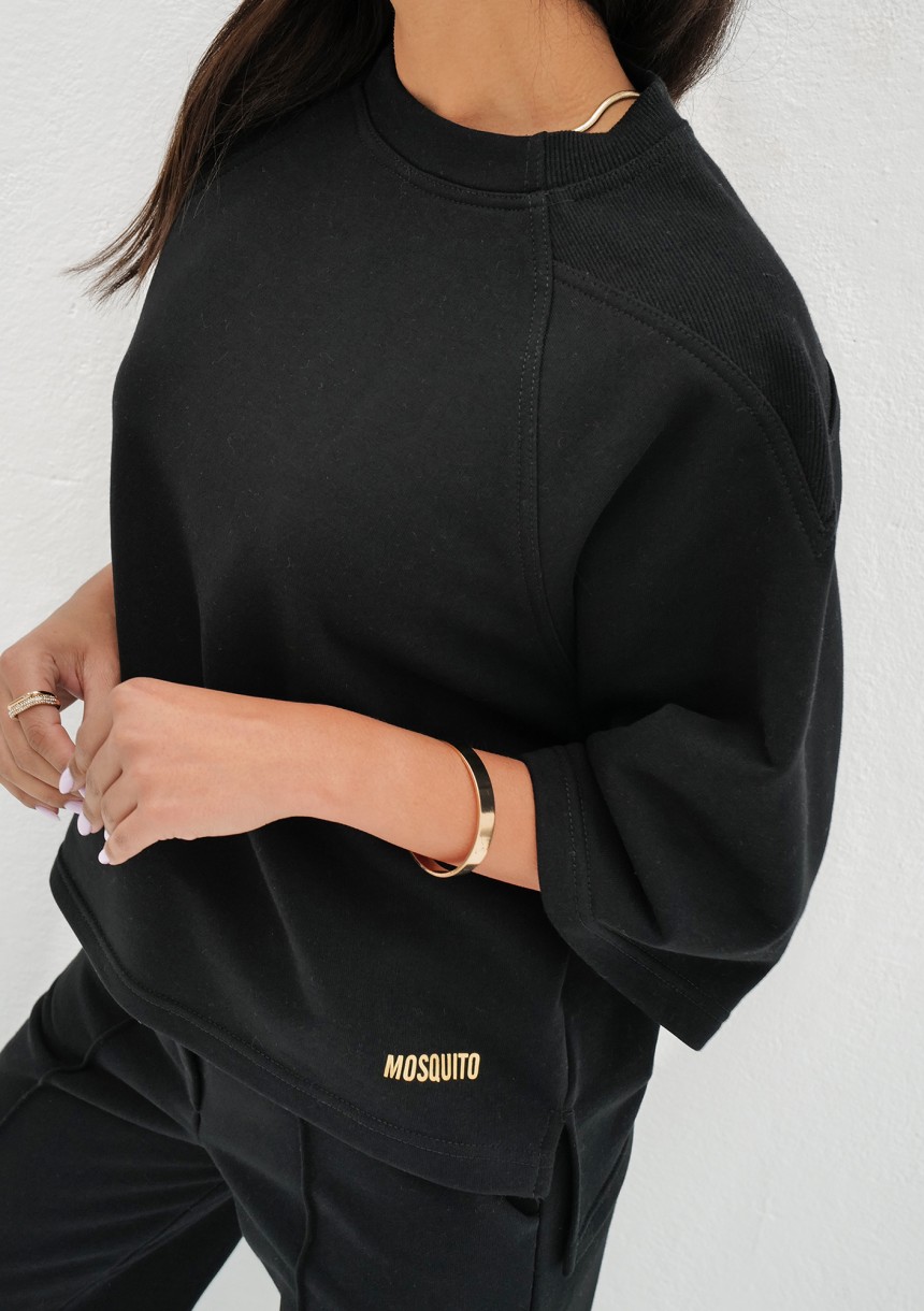 Lekka, czarna bluza damska z miękkiej dzianiny bawełnianej. Wygodny fason z rękawem o długości 3/4 na cieplejszy sezon.