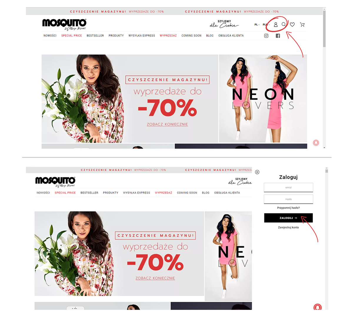 1. Kliknij na ikonę TWOJE KONTO i zaloguj się, aby przejść do historii zamówień.
