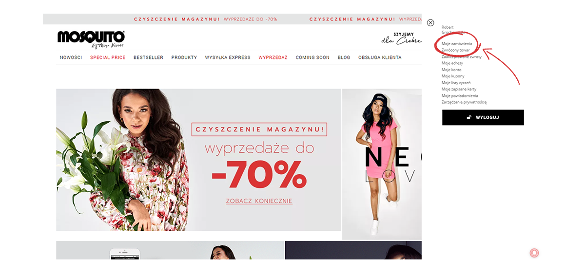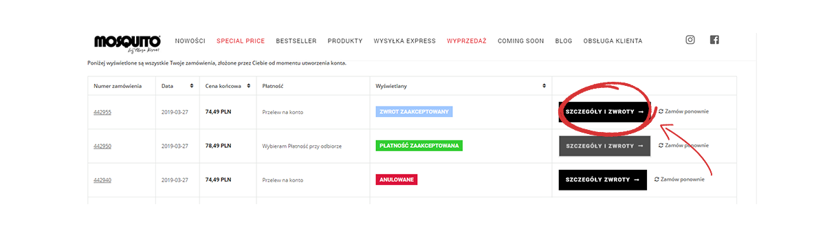 2. W zakładce MOJE ZAMÓWIENIA znajdziesz historię Twoich dotychczasowych zamówień. Przy zamówieniu, z którego pochodzą zwracane produkty zaznacz pole SZCZEGÓŁY i ZWROTY.