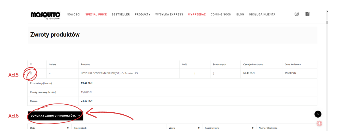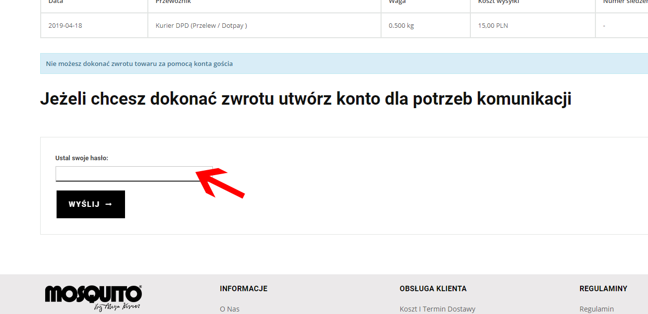 3. Po rozwinięciu strony pojawi się sekcja zwrotu produktu