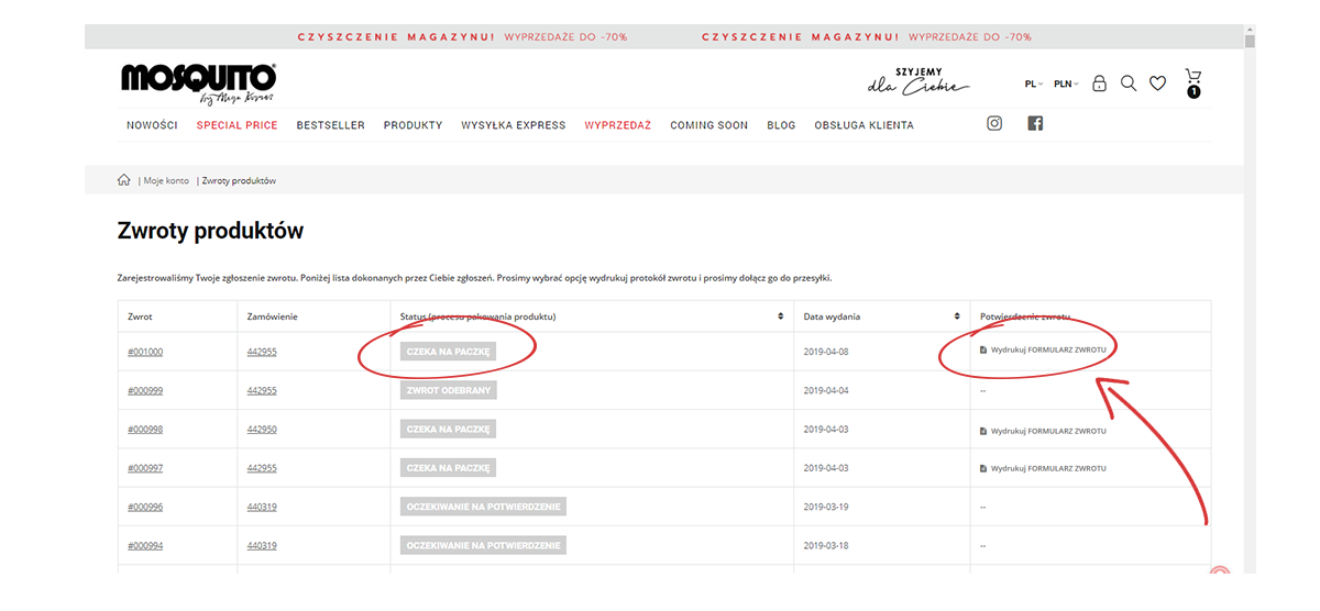 8. Ważne! Po przeniesieniu na kartę zwrotów WYDRUKUJ wypełniony FORMULARZ ZWROTU!