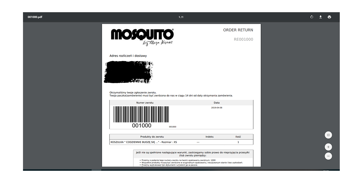 9. Wydrukowany formularz dołącz do zwracanego zamówienia. Spakuj bezpiecznie paczkę i odeślij na wskazany w formularzu adres w terminie 14 tu dni od zgłoszenia zwrotu.
