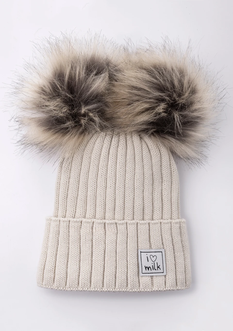 Beżowa czapka dziecięca na zimę oczaruje każdego szkraba efektownymi pomponami ze sztucznego futerka, a także przyjemną, niedrażniącą dzianiną.