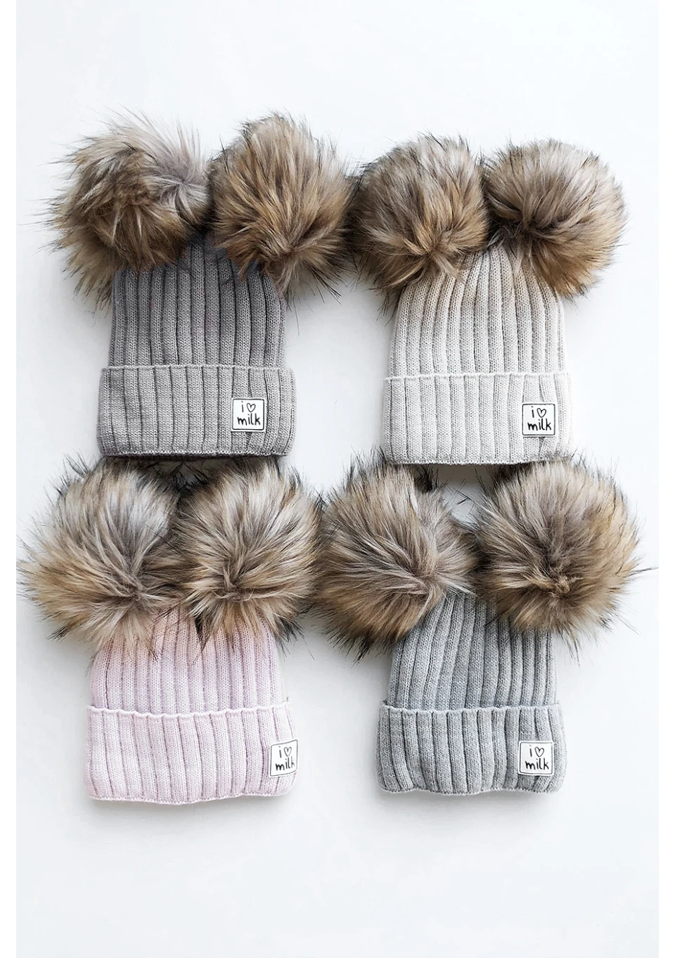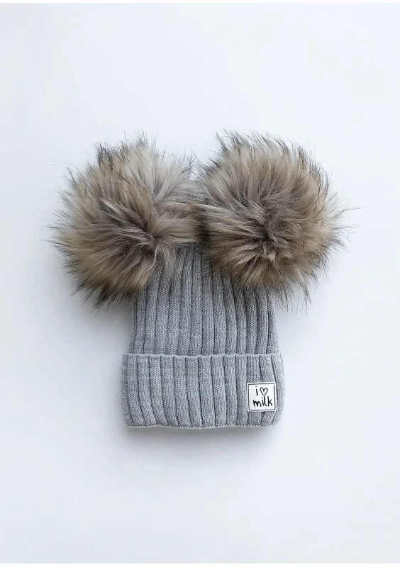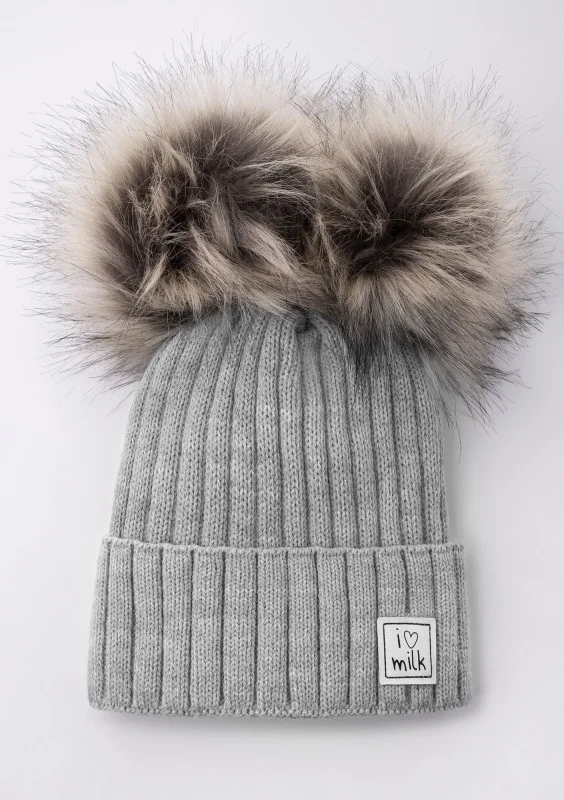 Szara czapka zimowa z futrzanymi pomponami, wykonana z miękkiej i optymalnie ciepłej dzianiny, od spodu podszyta polarem. Skutecznie osłoni przed mrozem, zakryje główkę i uszy.