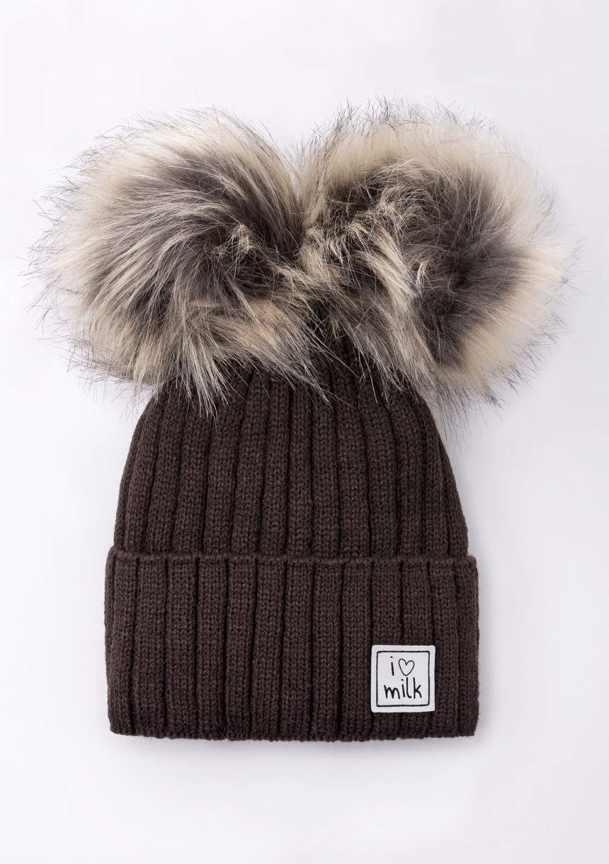 Brązowa czapka zimowa z futrzanymi pomponami, wykonana z miękkiej dzianiny akrylowej, podszytej ciepłym polarem.