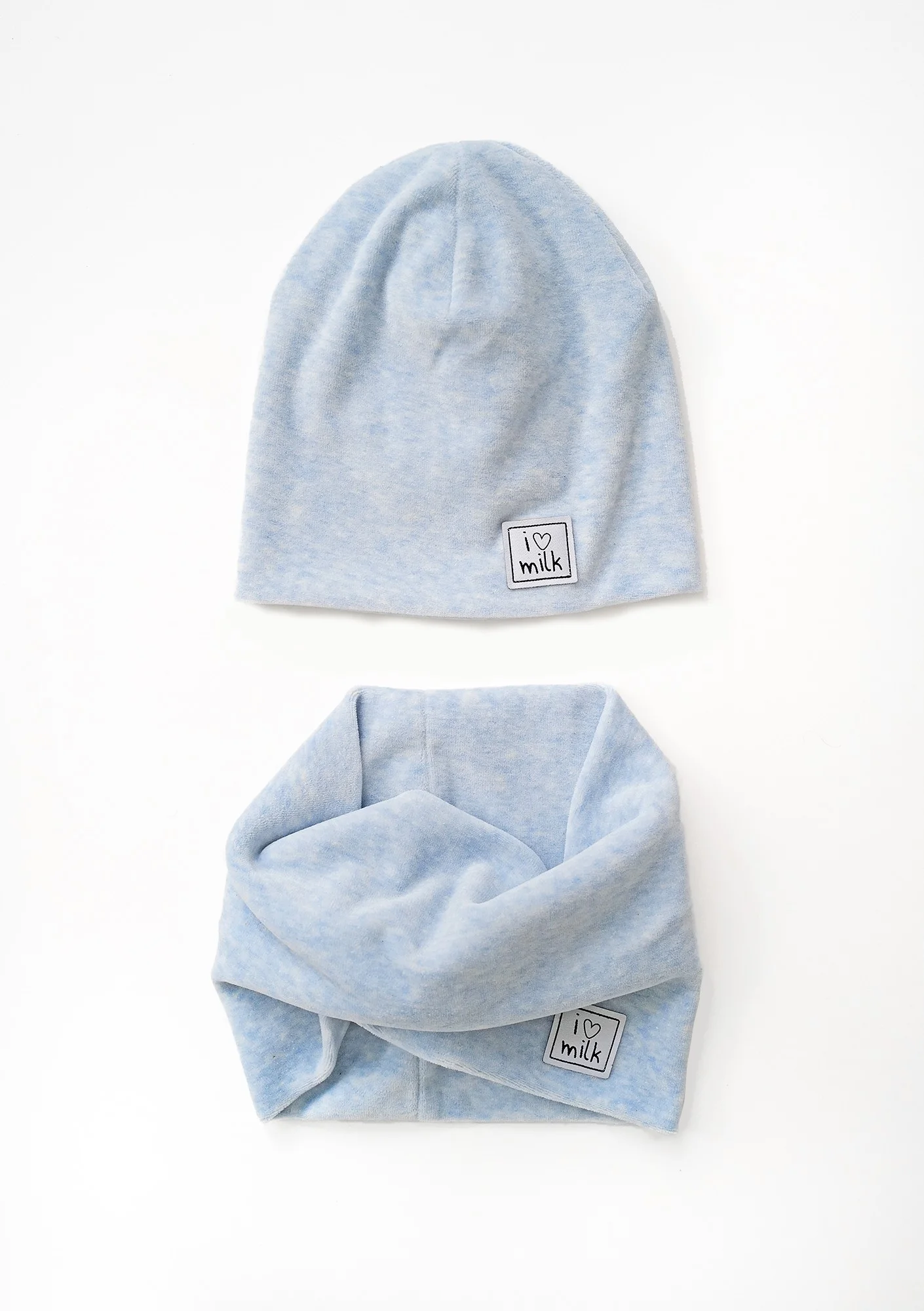 Miękki, welurowy komplecik ucieszy każdego maluszka zwracającego uwagę na trendy i kolory. Błękitna czapka dziecięca i komin wykonane zostały z miękkiej dzianiny welurowej, oczarują nie tylko miłą w dotyku fakturą, ale i delikatnym odcieniem błękitu. Starannie wykonane produkty spełnią ważną funkcję w okresie przejściowym: osłonią przed chłodem i wiatrem podczas wczesnowiosennych zabaw i aktywności na świeżym powietrzu.