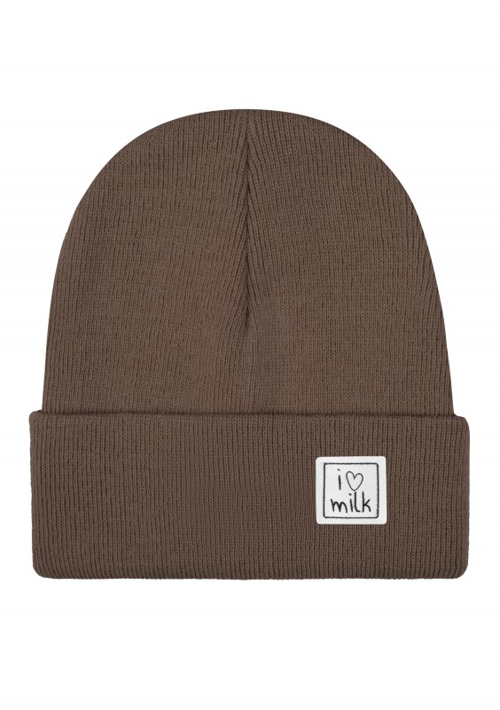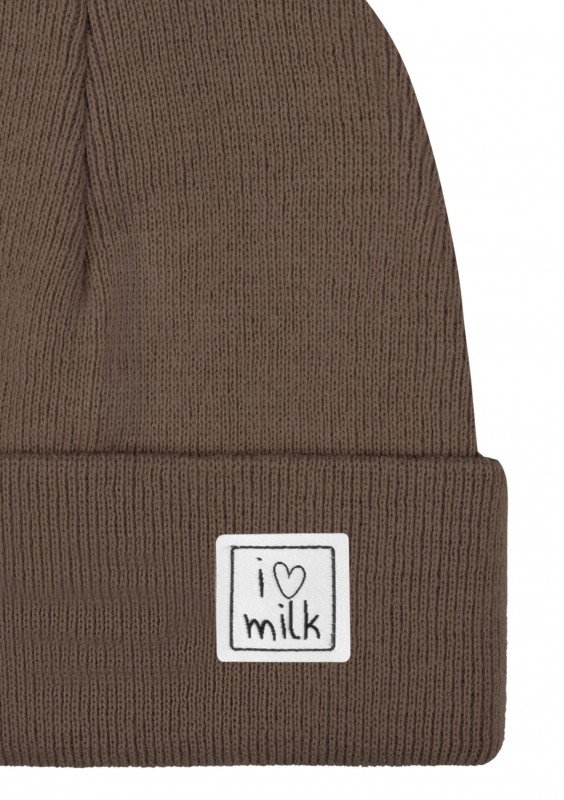 Stylowa czapka dla dzieci o dopasowanym kroju beanie, ozdobiona naszywką z logiem naszej marki I Love Milk. Wykonana z miękkiej dzianiny w brązowym kolorze.
