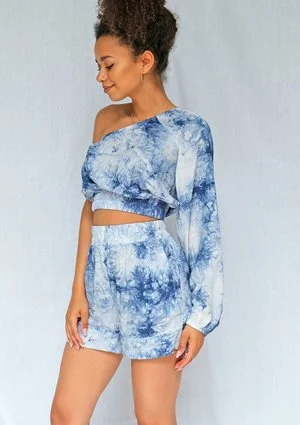 Asymetryczny komplet damski letni to propozycja odpowiednia dla tych, którzy nie boją się wyróżniać z tłumu. Prezentowany zestaw będzie idealny na co dzień - na spotkanie z przyjaciółmi, spacer po mieście, wyjście na plażę czy do klubu tanecznego. Dzięki dobrze przemyślanemu fasonowi pozwoli poczuć się dobrze w swoim ciele nawet tym kobietom, które nie są do końca zadowolone z proporcji swojej sylwetki. Komplet będzie idealny na bardzo ciepłe dni w sezonie letnim. Składa się z szortów z wysokim stanem i luźnymi nogawkami wykończonymi na szeroką zakładkę, dlatego dobrze maskuje niedoskonałości w okolicach brzucha czy ud, jednocześnie podkreślając talię. Góra zestawu to z kolei krótki top wykończony ściągaczem. Jego atut stanowi efektowna asymetria w postaci długiego rękawka z modna bufką. Całość utrzymana jest w chłodnej, biało-granatowej kolorystyce z efektem farbowania DIY.