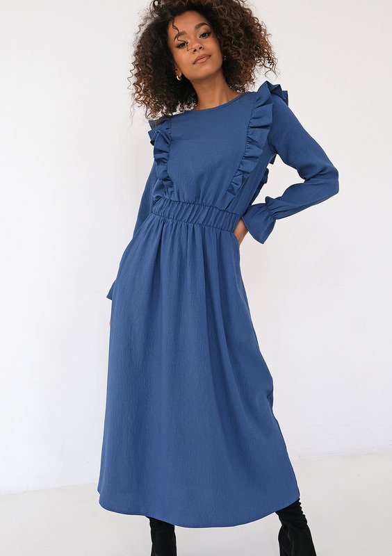Olena - Sukienka midi z falbankami Niebieska