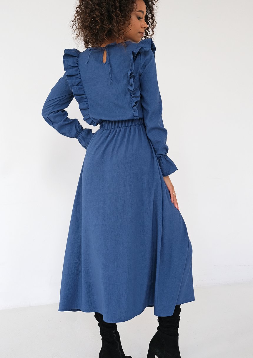 Niebieska sukienka midi to wygodna kreacja na chłodny sezon. Casualowy fason zapewnia poczucie lekkości, jak i elegancki wygląd. Model został ozdobiony falbankami wzdłuż dekoltu i na plecach, a także wyposażony w kieszenie.