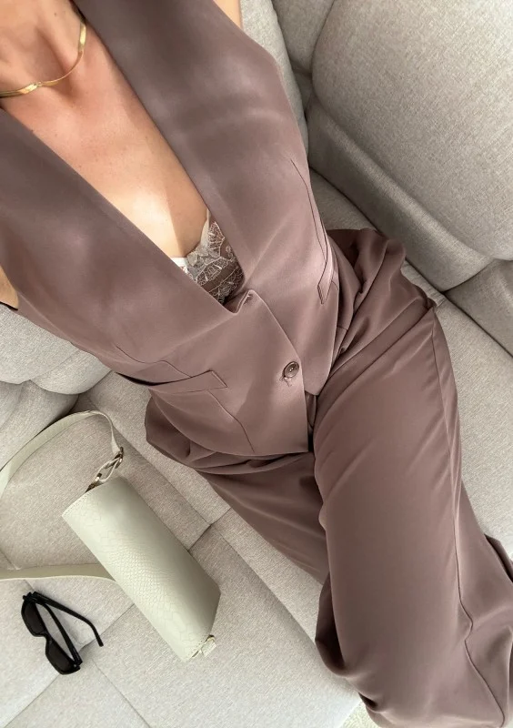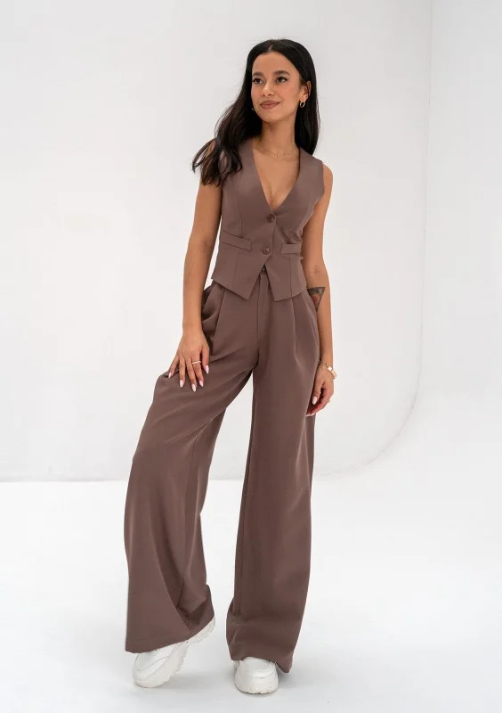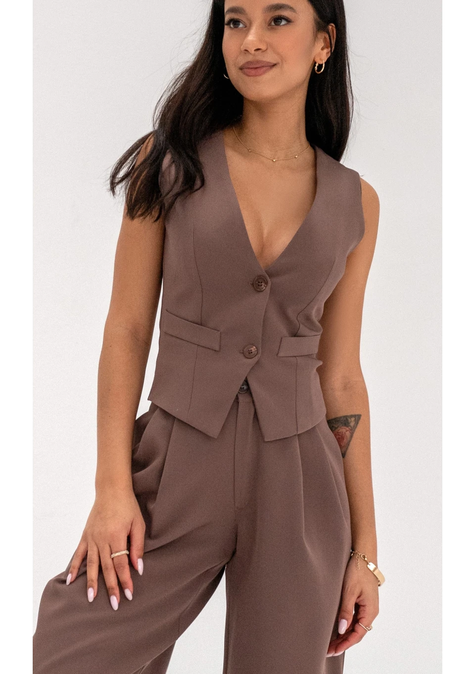 Brązowa kamizelka damska zapinana na guziki. Doskonale dopasowana do sylwetki doda elegancji. Małe wiązanie z tyłu podkreśla wyrafinowany design.