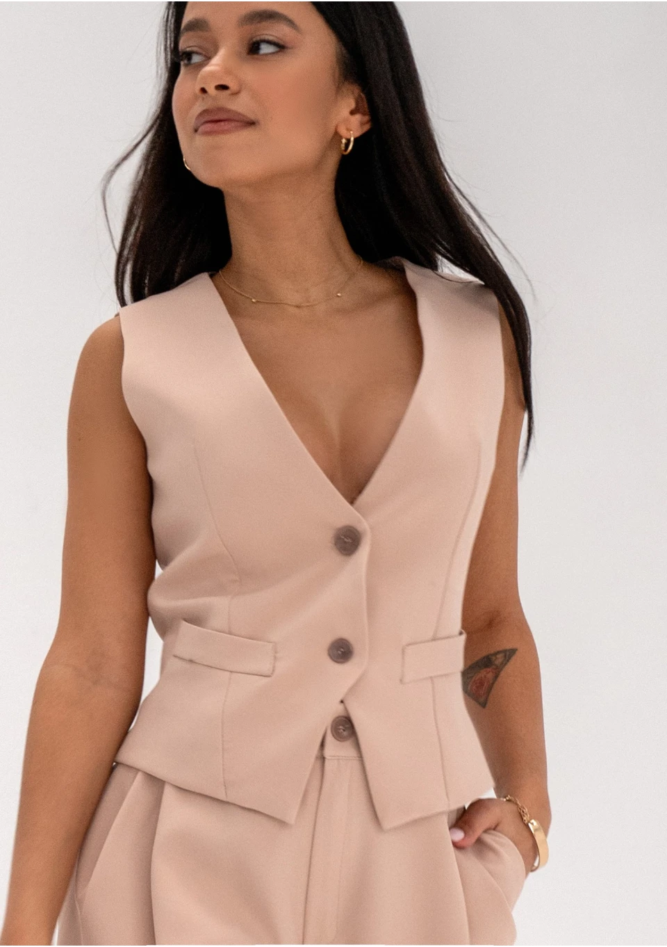Beżowa kamizelka damska o dopasowanym kroju, zapinana guzikami. Z tyłu drobne wiązanie subtelnie zwieńczające wyrafinowany design.
