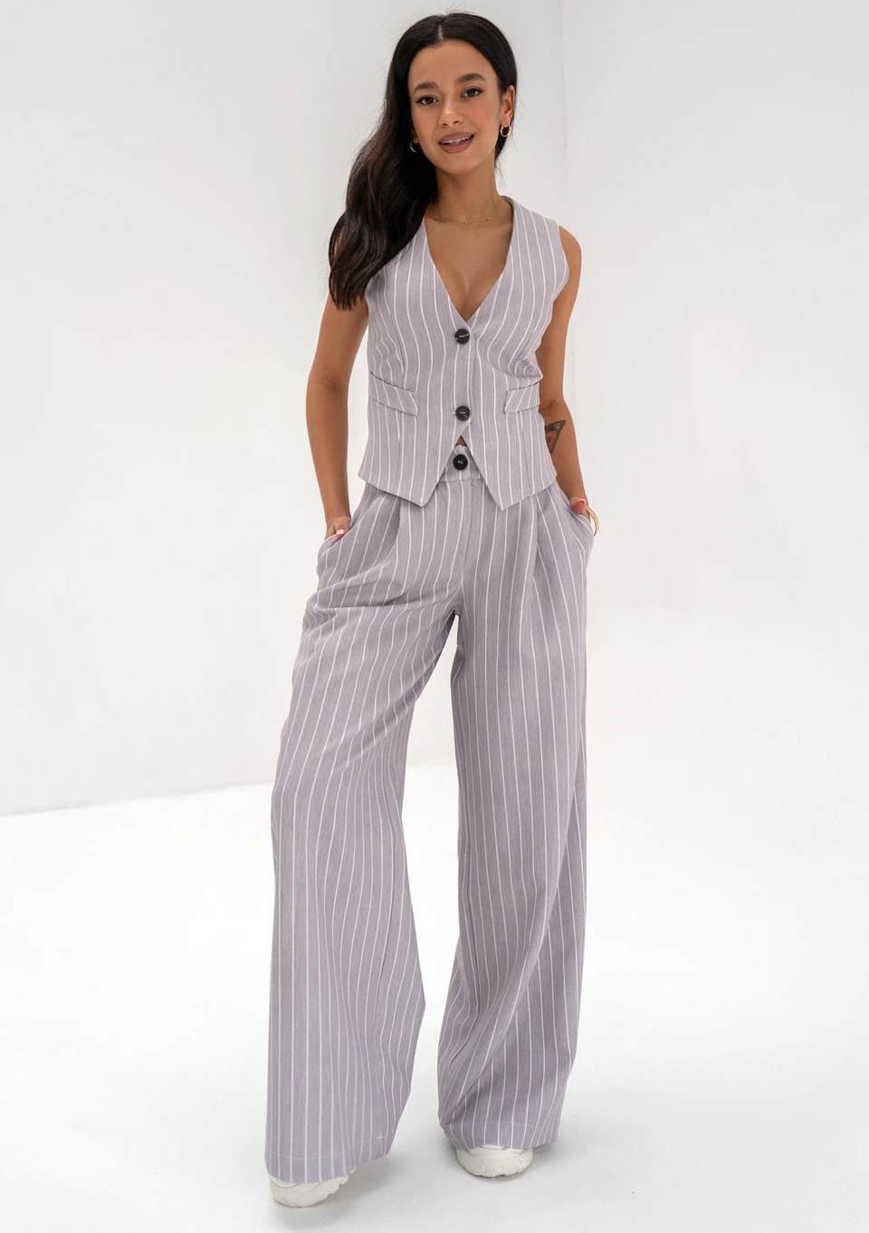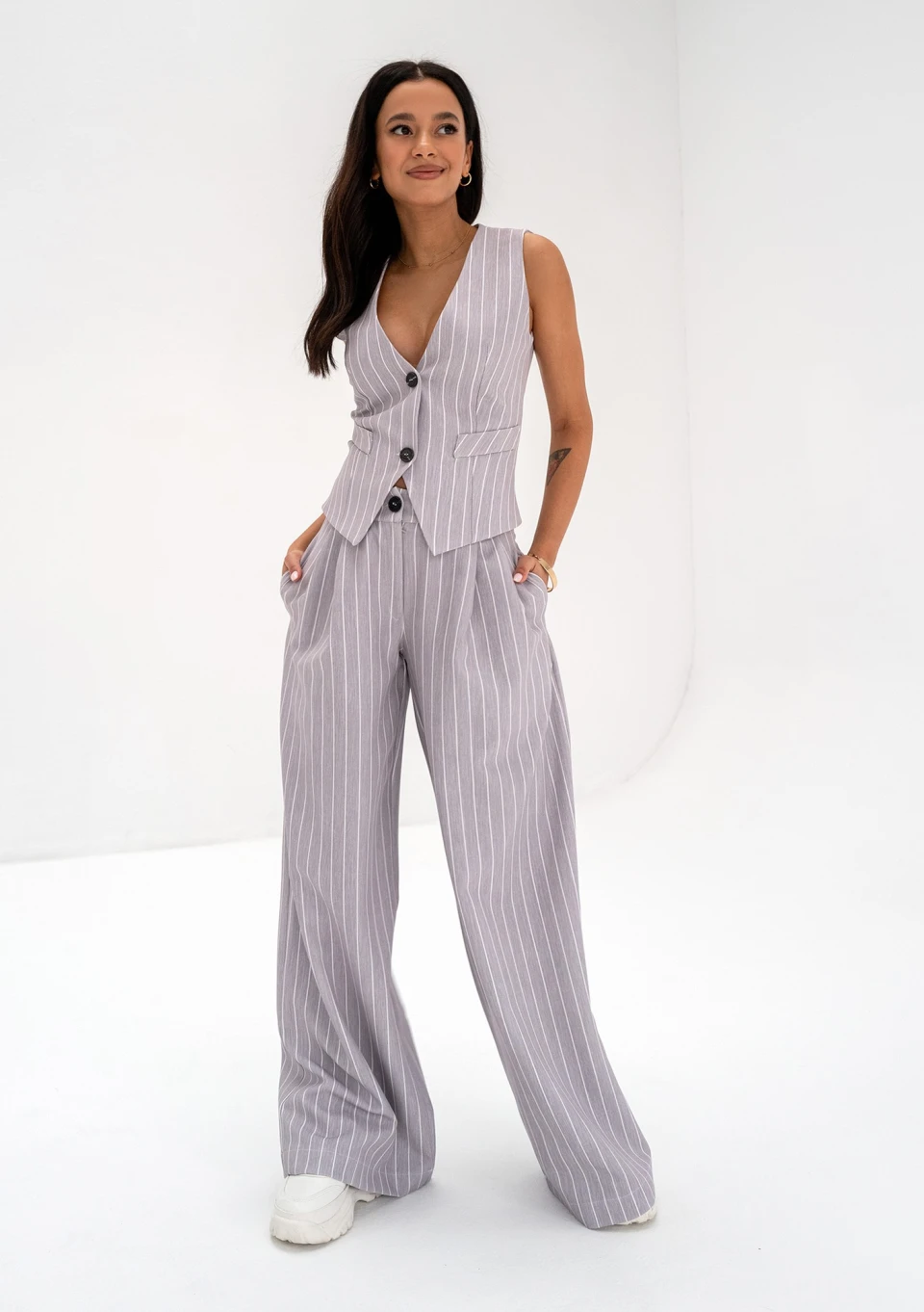 Designerska kamizelka damska o dopasowanym kroju z drobnym wiązaniem z tyłu. Zapinana na guziki. Wykonana z materiału w prążki, w szarym kolorze.