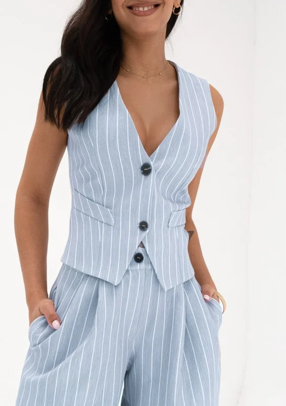 Designerska kamizelka damska o dopasowanym kroju z drobnym wiązaniem z tyłu. Zapinana na guziki. Wykonana z materiału w prążki, w błękitnym kolorze.
