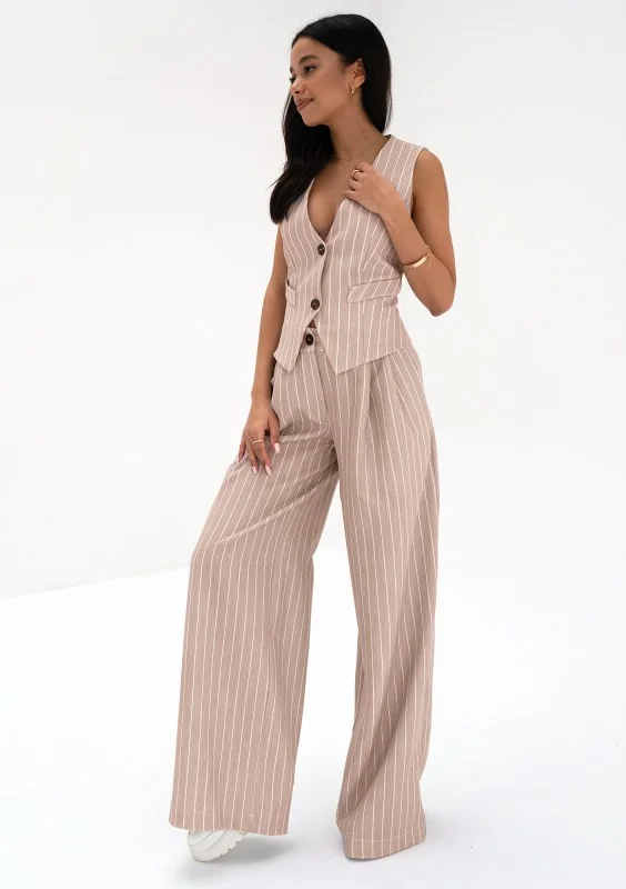 Modna kamizelka damska o dopasowanym kroju z drobnym wiązaniem z tyłu. Zapinana na guziki. Wykonana z materiału w prążki, w beżowym kolorze.