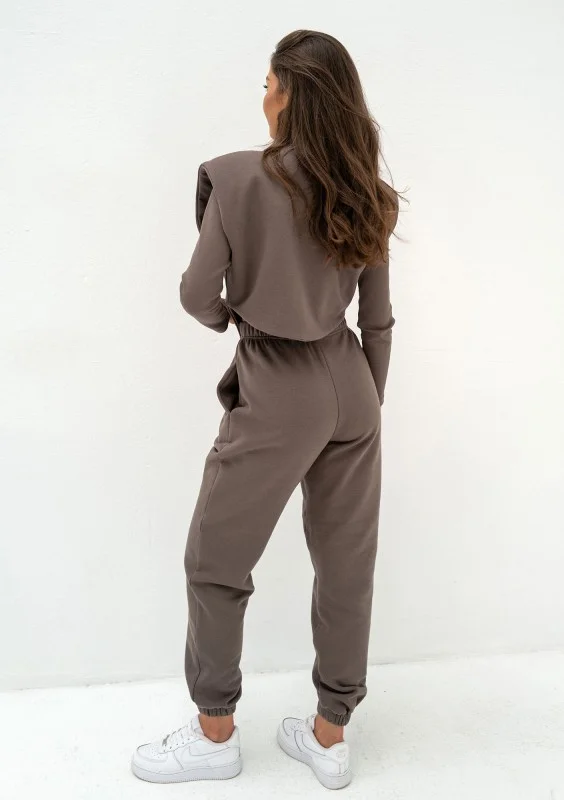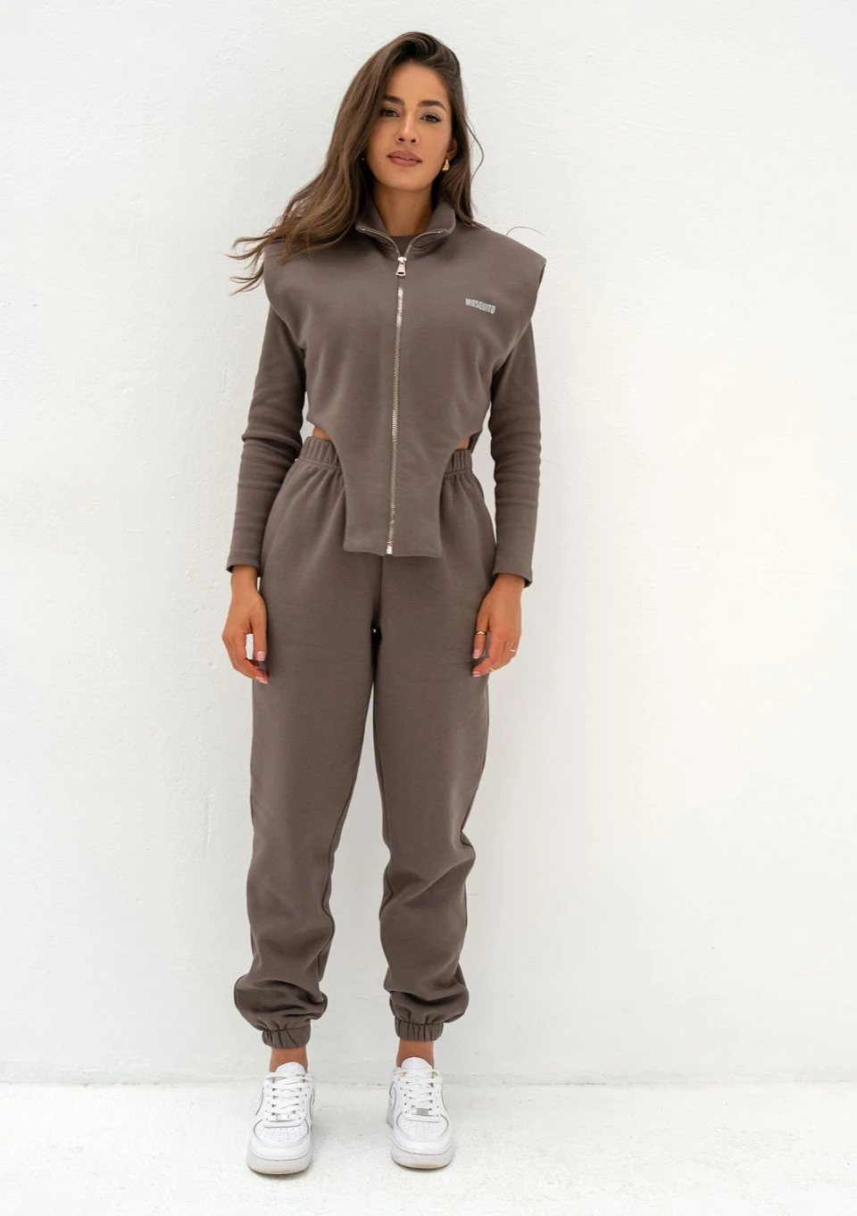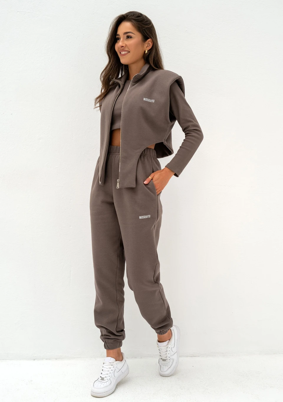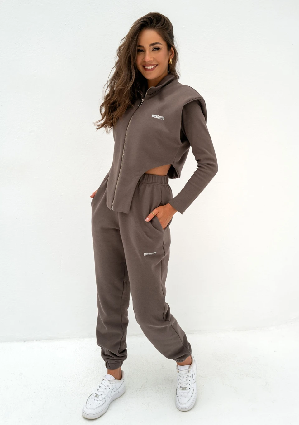 Stylowa kamizelka dresowa w sportowym stylu z długim, asymetrycznym przodem, wykonana z wysokiej jakości bawełny drapanej. Jej unikalny krój i ciepły brązowy kolor dodadzą charakteru każdej stylizacji. Została wzbogacona poduszkami na ramionach, dzięki nim zyskuje na wyjątkowości. Linia ramion jest cudnie zaznaczona i zwraca uwagę! Bezrękawnik idealny na co dzień, nieoficjalne okazje i luźne wyjścia, a także aktywności i wycieczki.