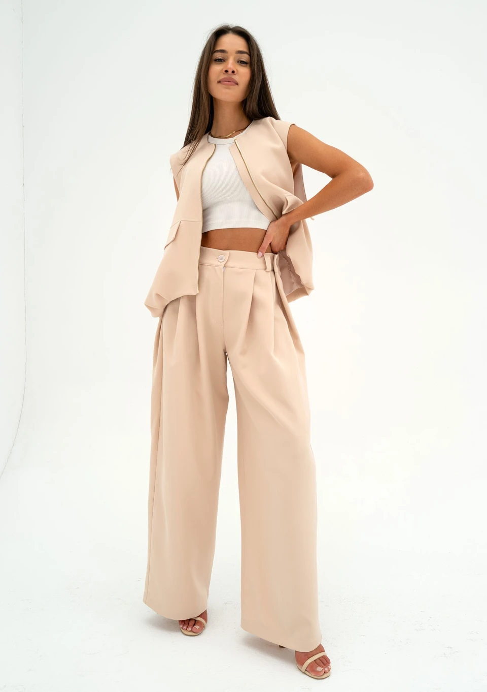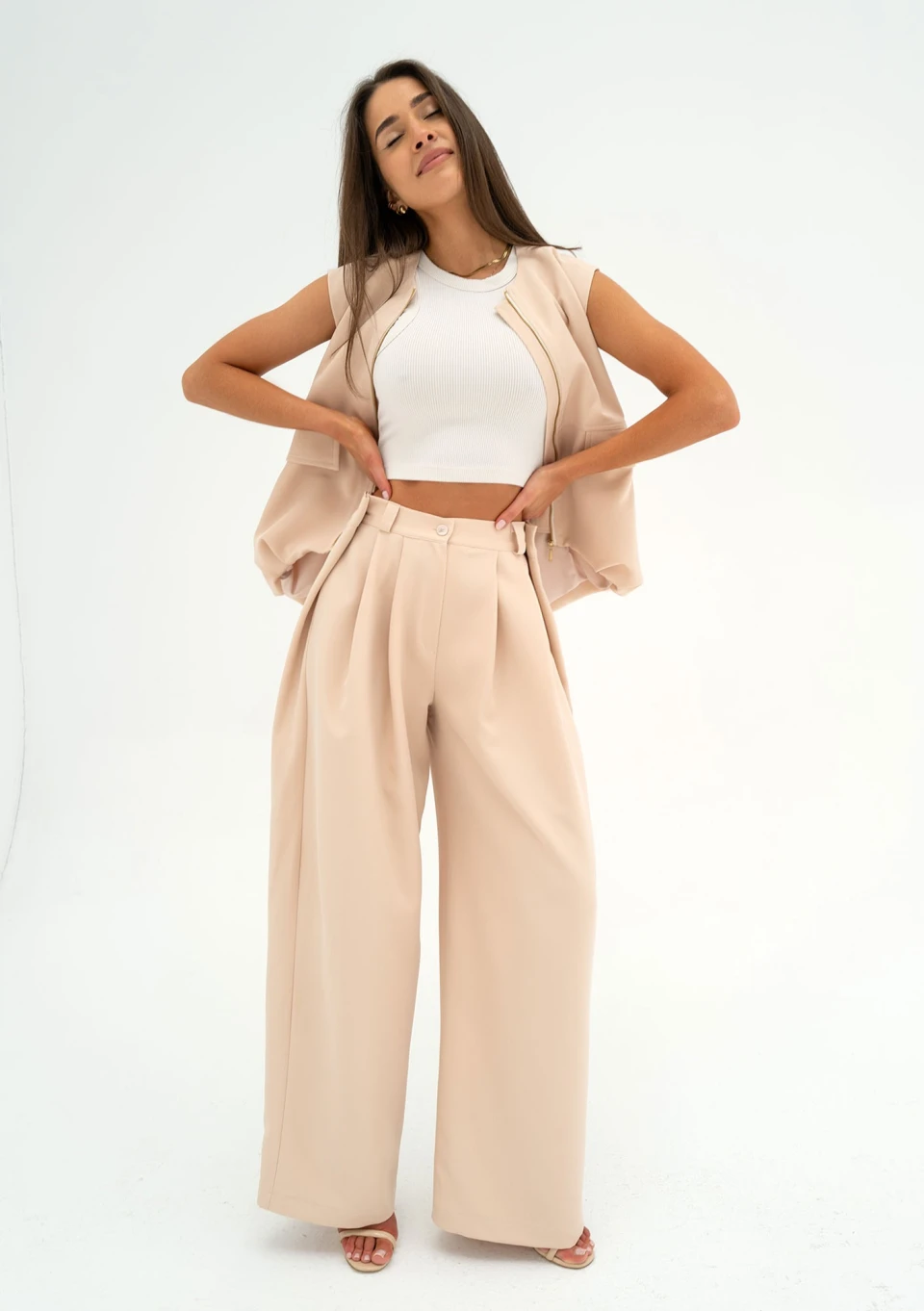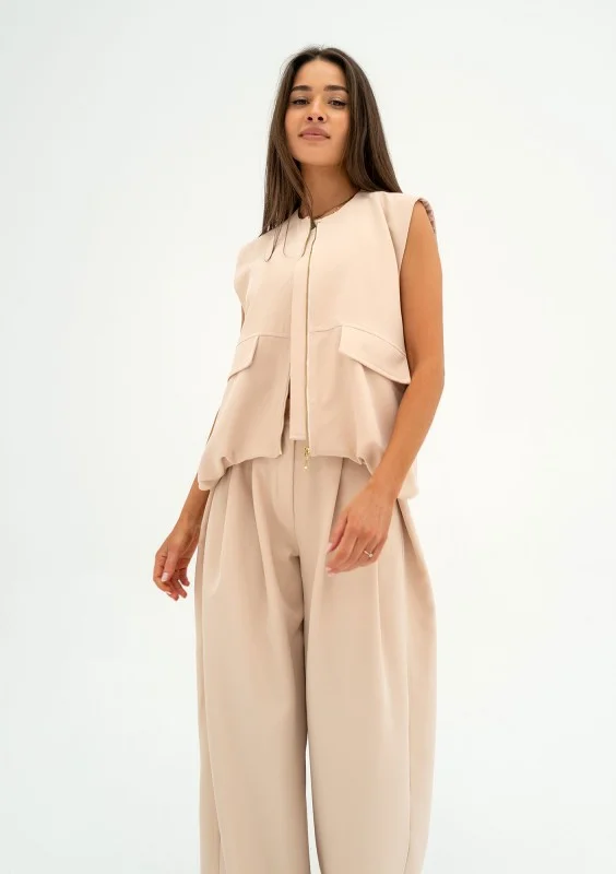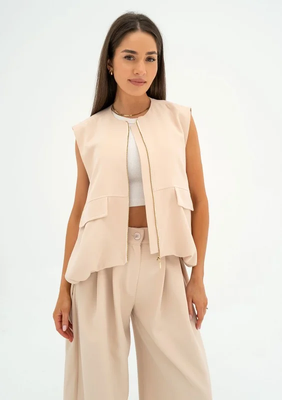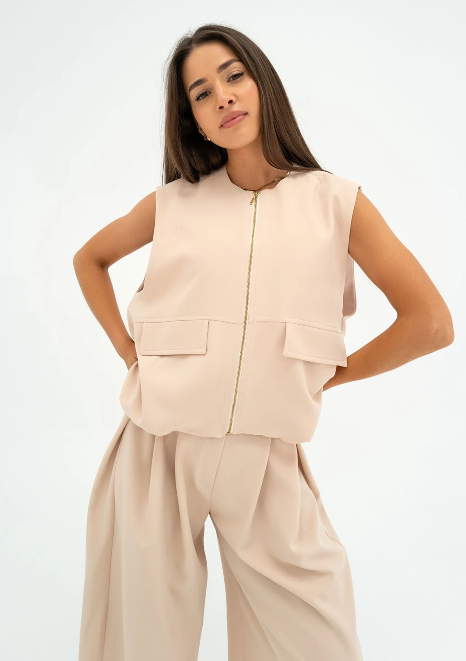 Beżowa kamizelka z modnym, bombkowym podszyciem. Wygodnie zapinana na zamek, wykonana z podszewką. Idealna na wiosnę.
