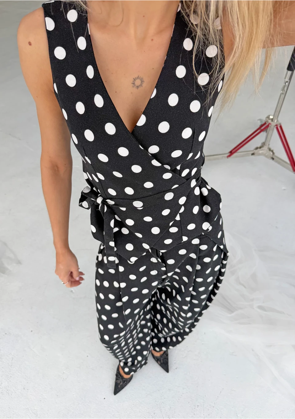 Elegancka kamizelka z lnu w grochy - oto pomysł na bazę efektownego wizerunku. Piękny, kopertowy fason z wiązaniem podkreśli walory sylwetki.