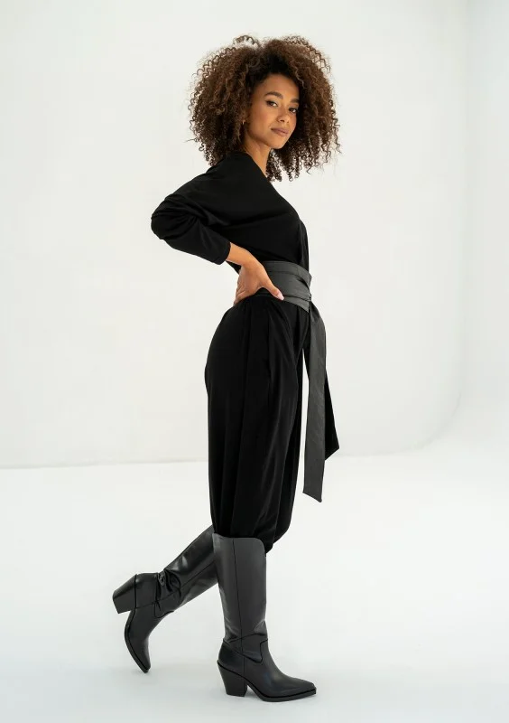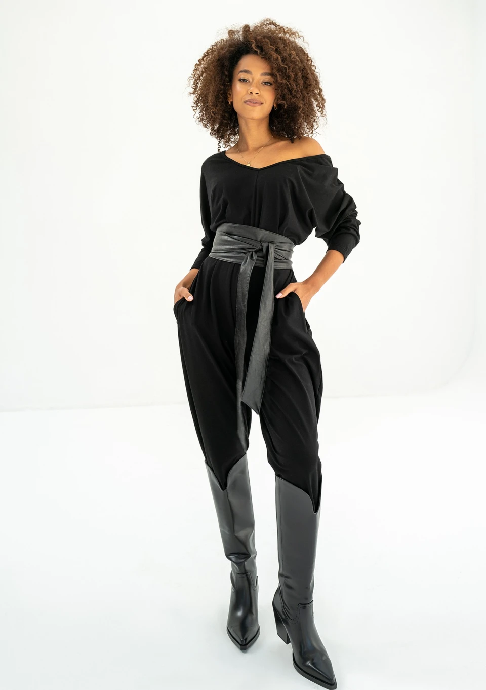 Czarny kombinezon damski z wiskozy, z kieszeniami i długim, czarnym paskiem imitującym skórę.
