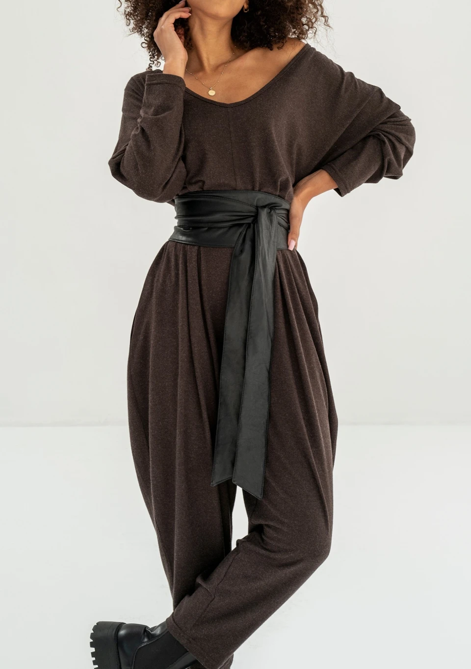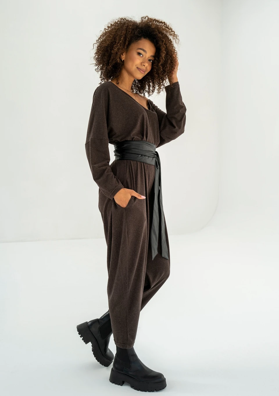 Brązowy kombinezon damski z wiskozy, z kieszeniami i długim, czarnym paskiem imitującym skórę.