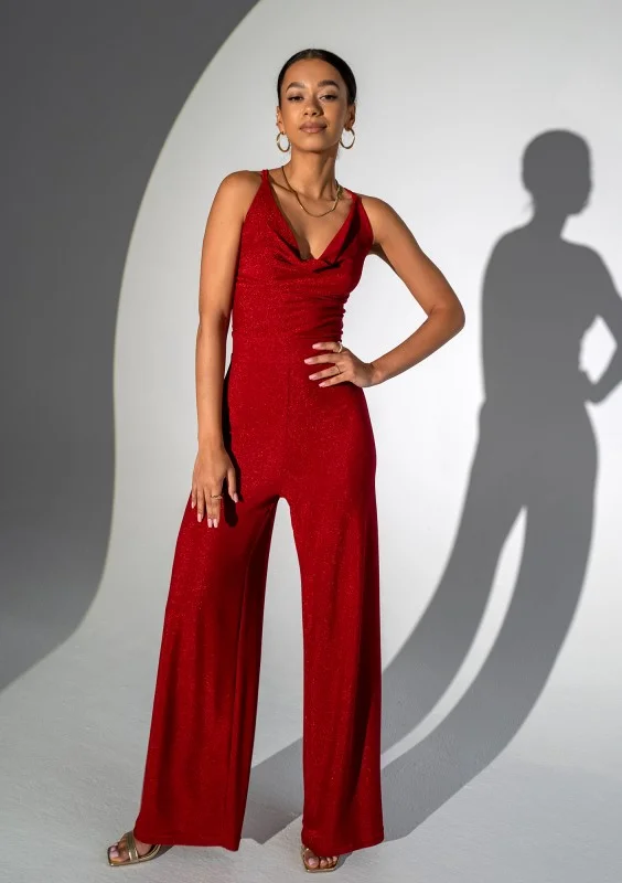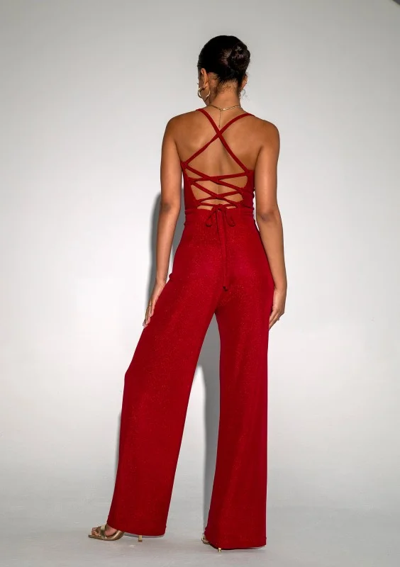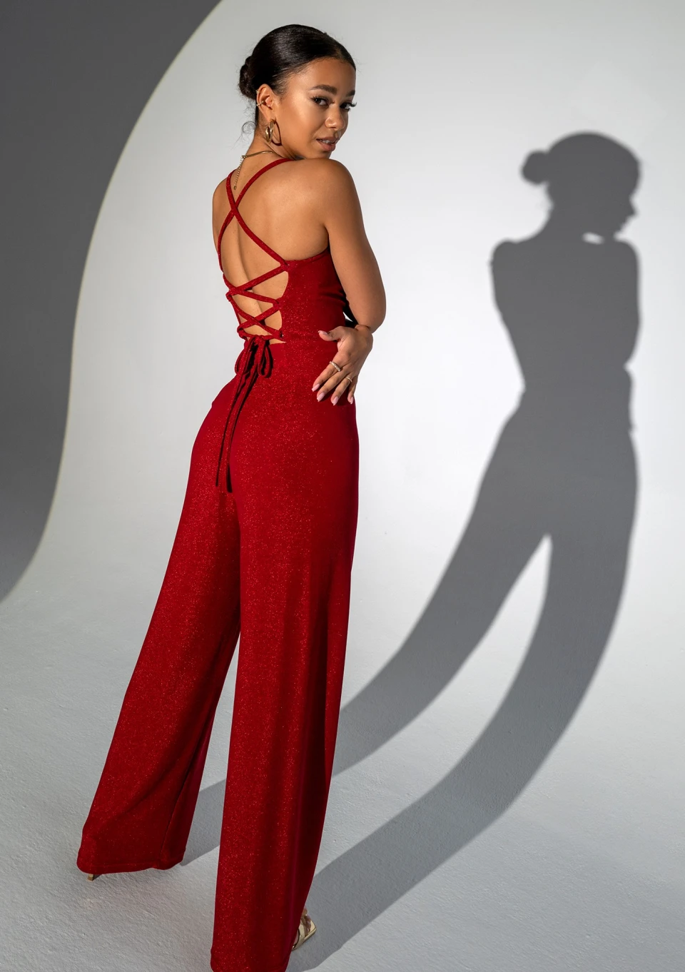 Czerwony kombinezon damski z tkaniny z błyszczącymi drobinkami. Model z lejącym dekoltem i odkrytymi plecami, na których olśniewa zmysłowym sznurowaniem.